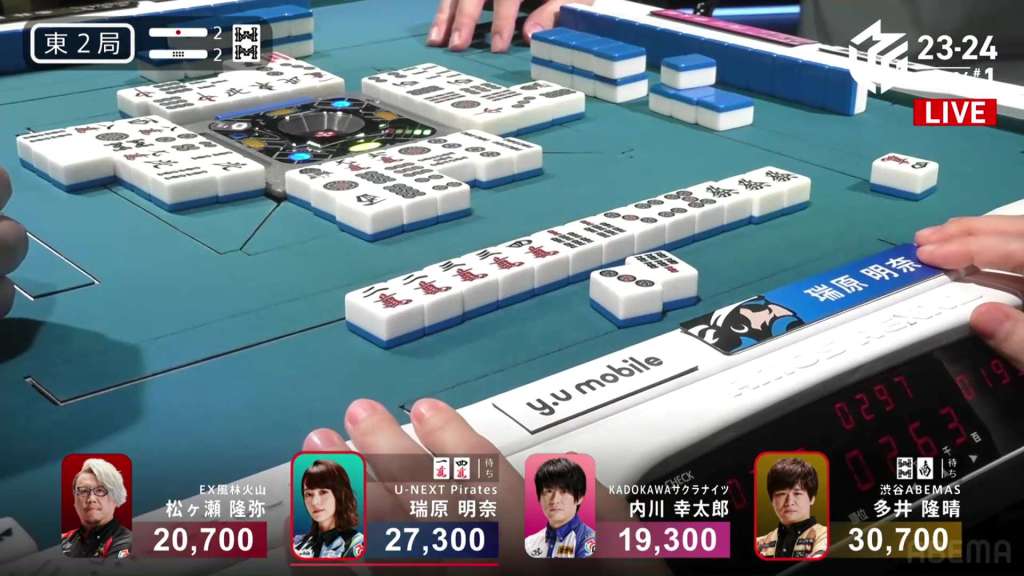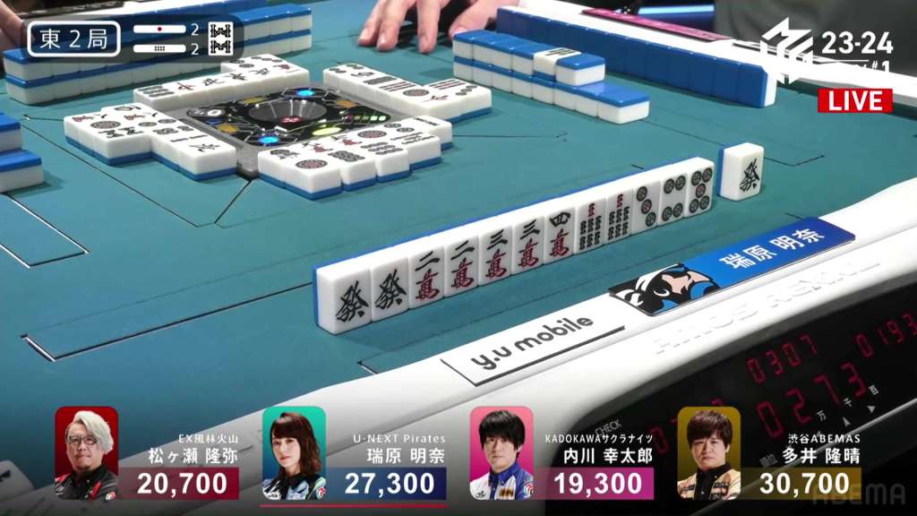 In E2-2, Mizuhara is in 2nd place and 3,400 behind 1st place Ooi. With two riichi sticks and two honba, any win will let her go up a rank.