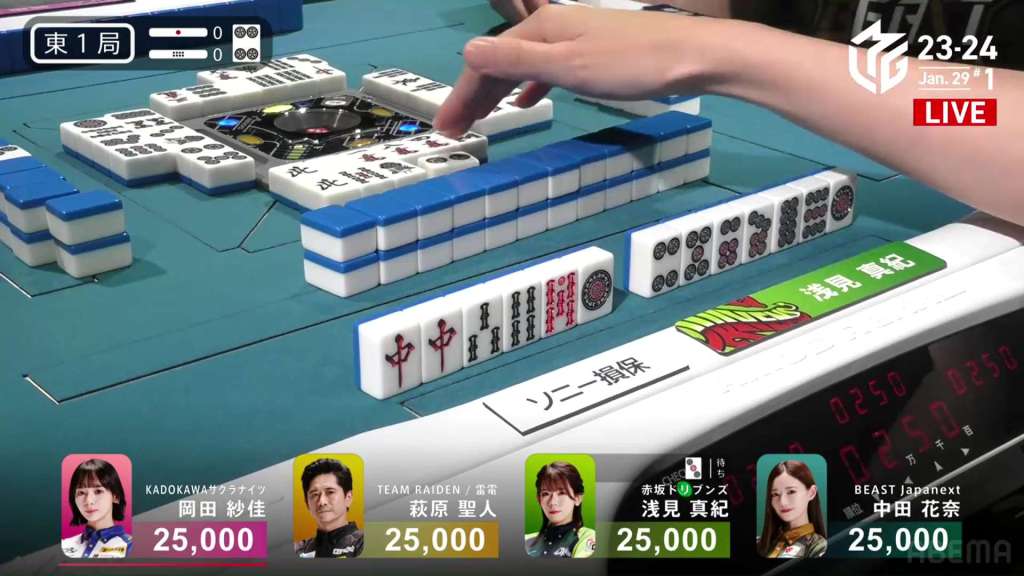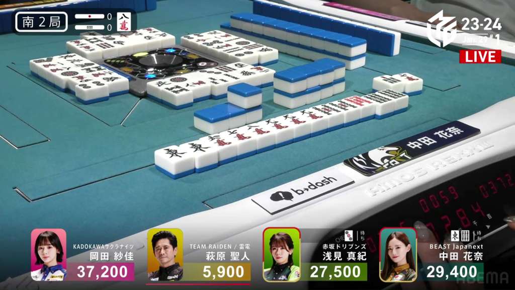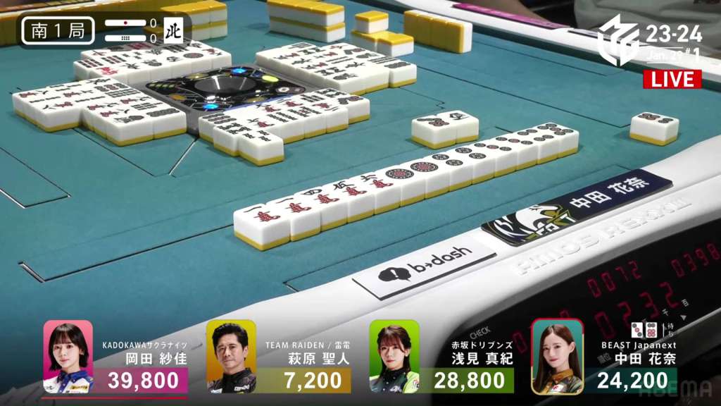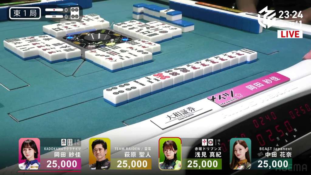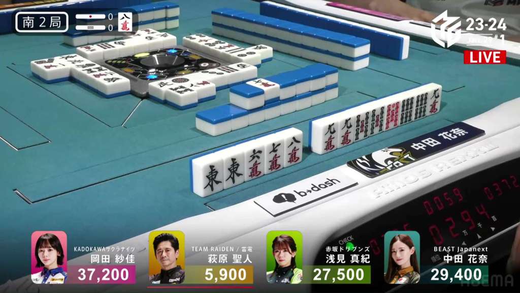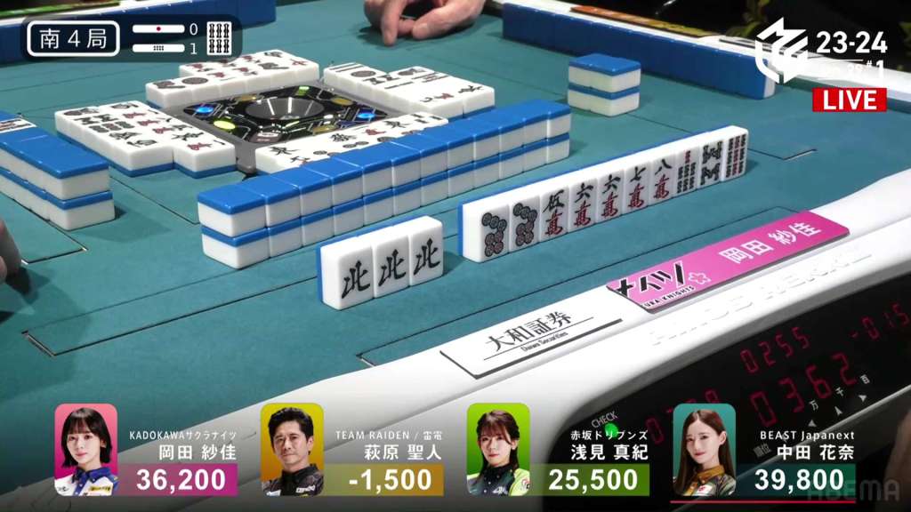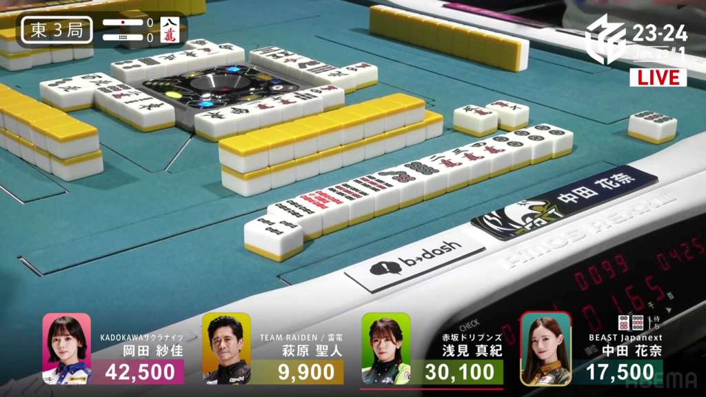 In E3-0, Nakada is in 2nd place, 12,600 behind 2nd place Asami and 25,000 behind 1st place Okada. Being the only player left to not have a 1st place, she really wants to win this game.