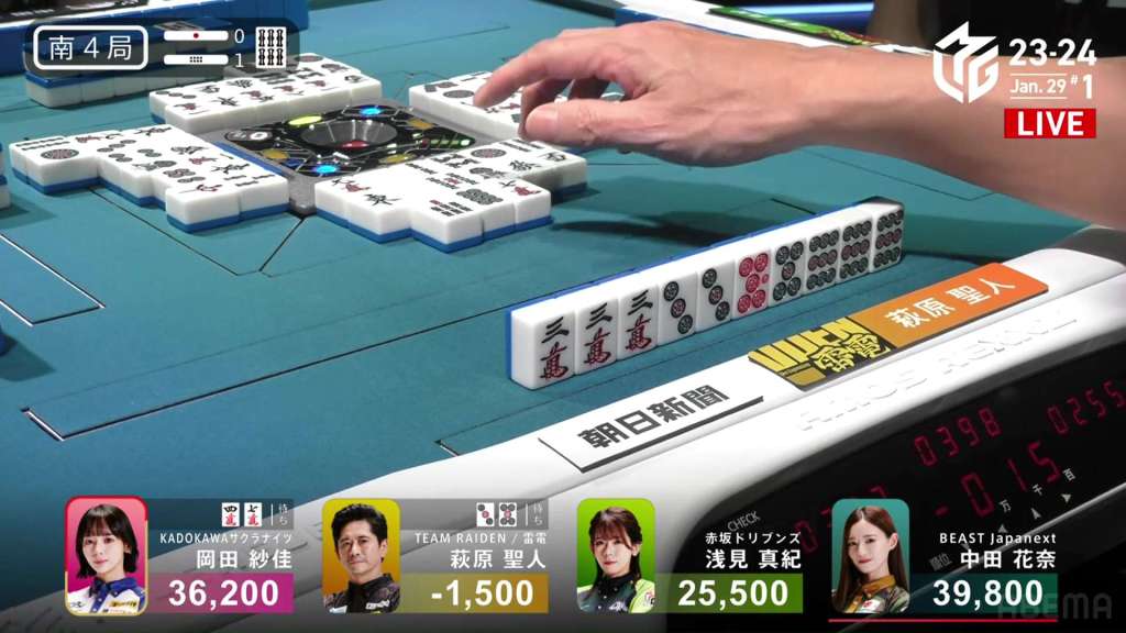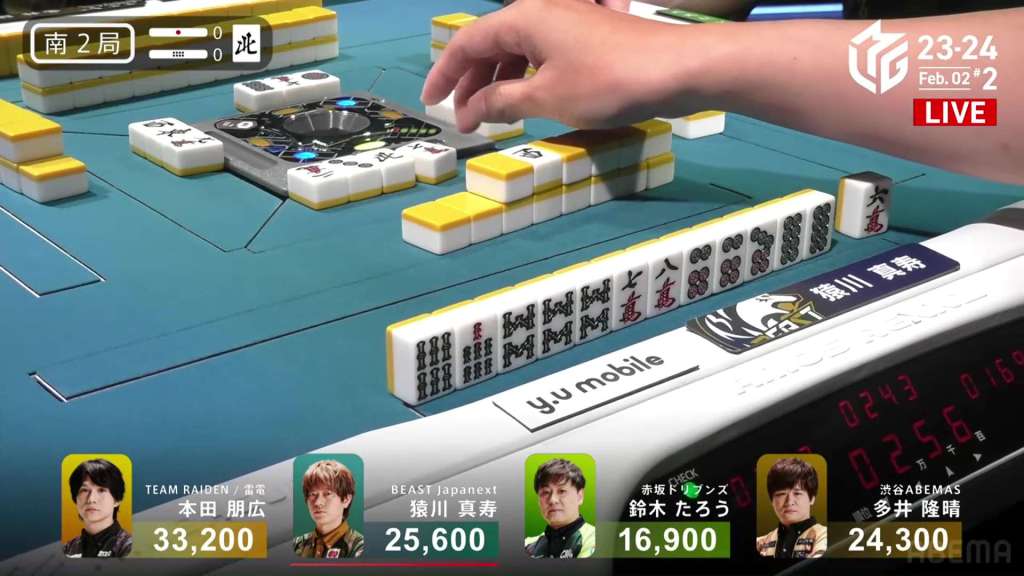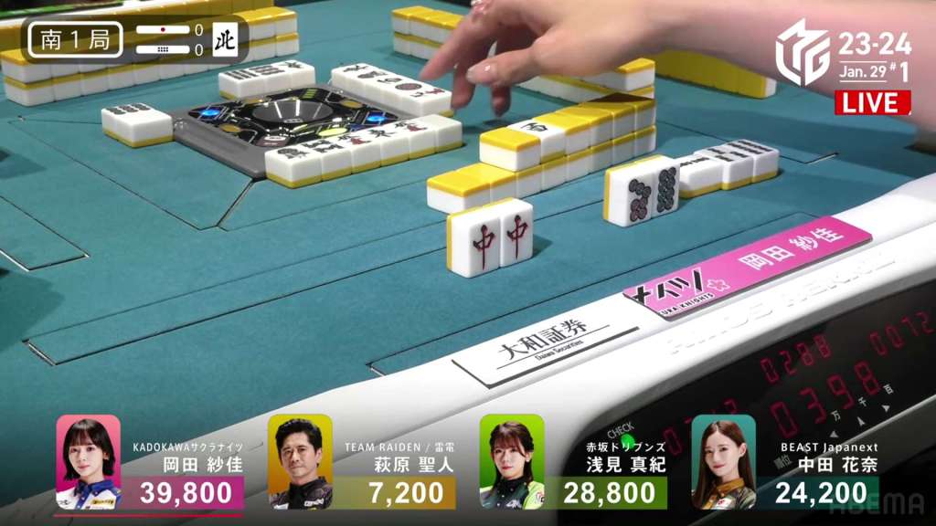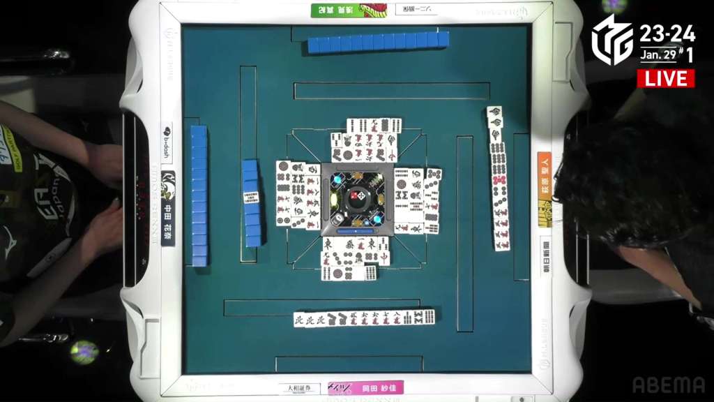 In the middle of the second row, Hagiwara draws and discards the 7m, giving Okada the chance to win the hand
