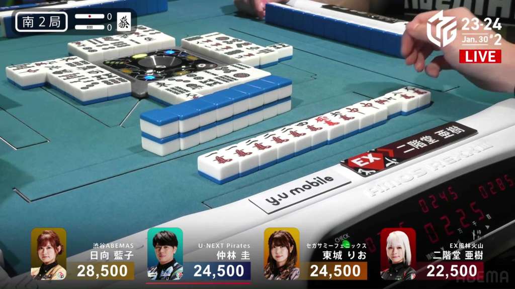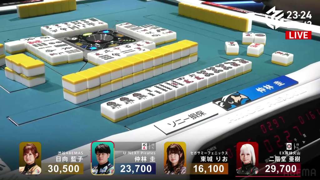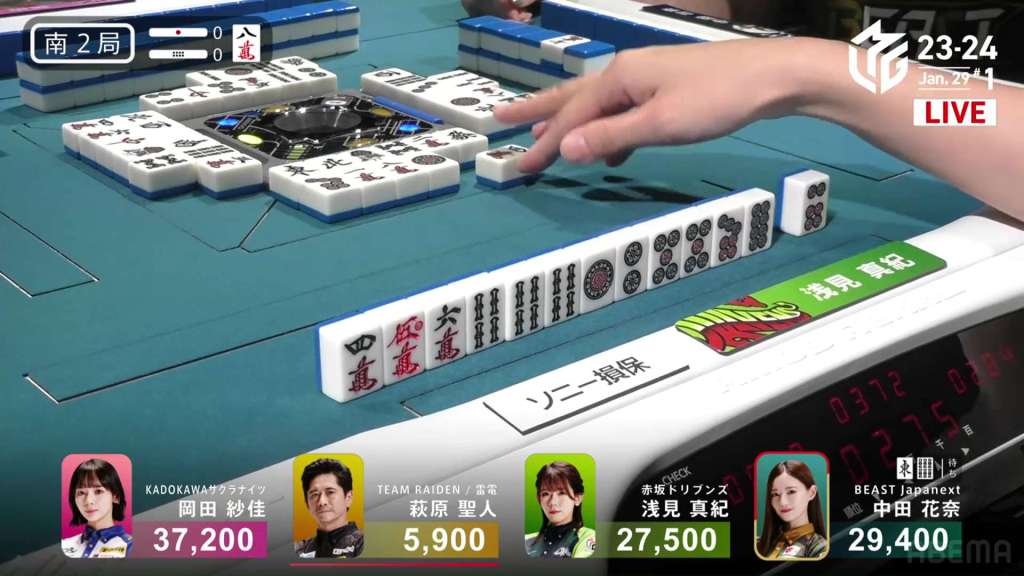 However, Okada does not win off it since it would not be enough! The hand keeps going, with Hagiwara folding for one turn and getting back to tenpai on the very last tile in the wall. Eventually, it all ends in a draw and Okada and Hagiwara the only ones tenpai, giving Nakada her very first M-League win.