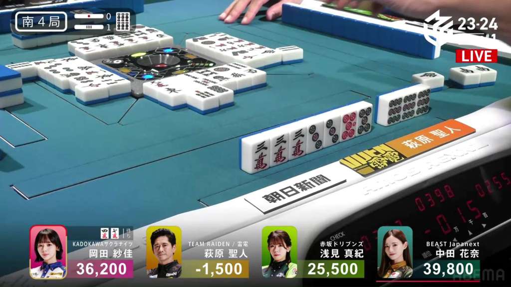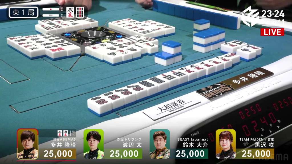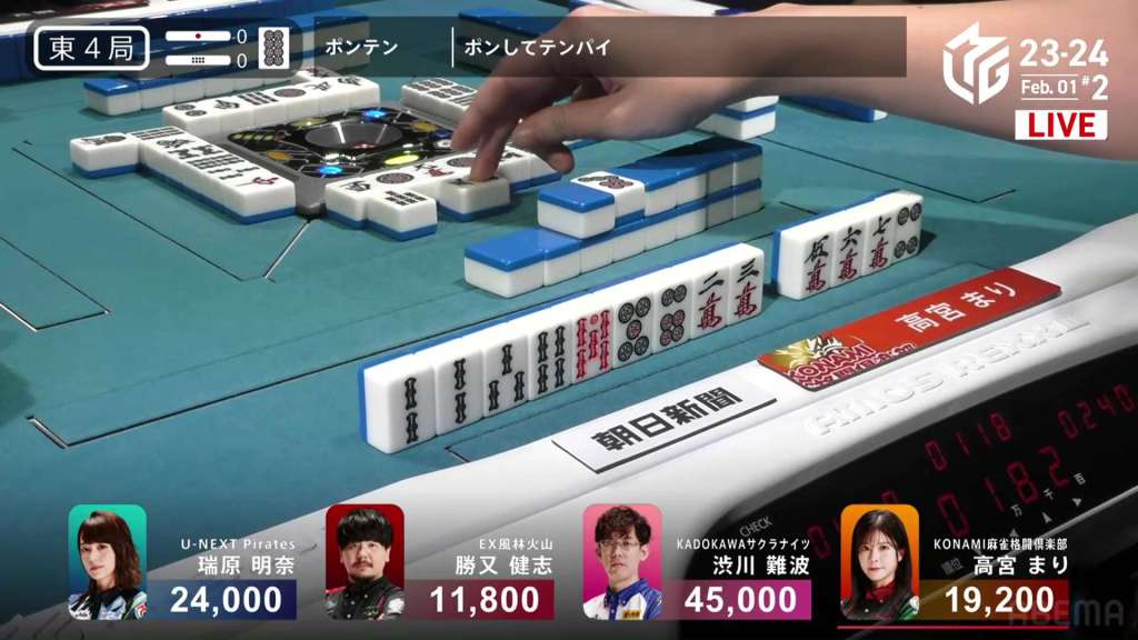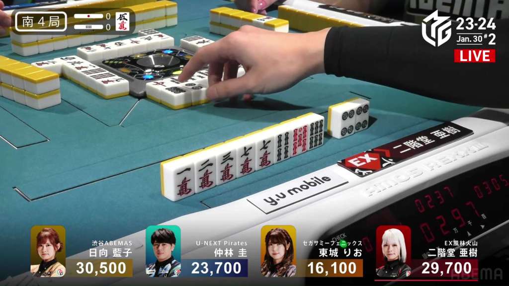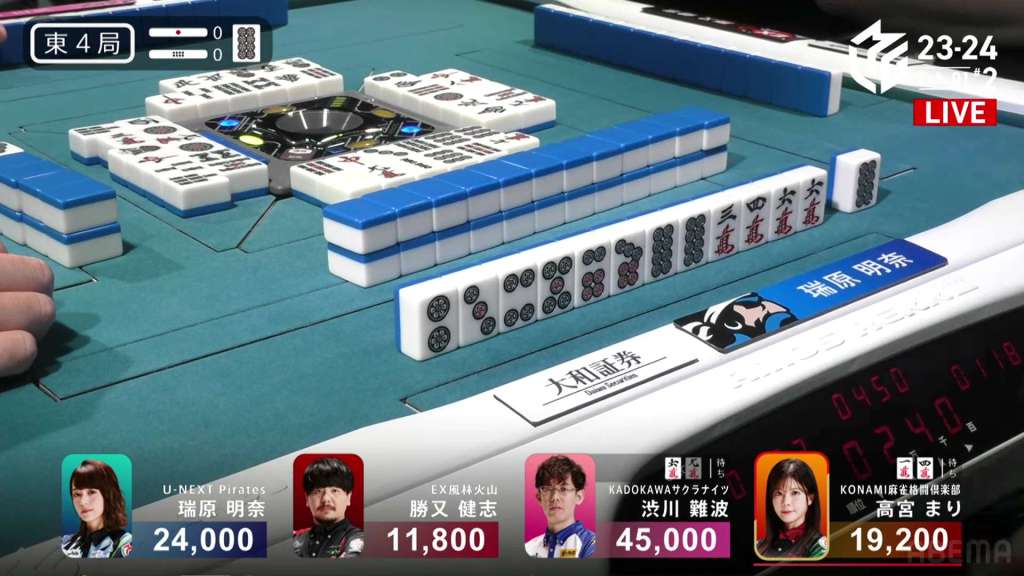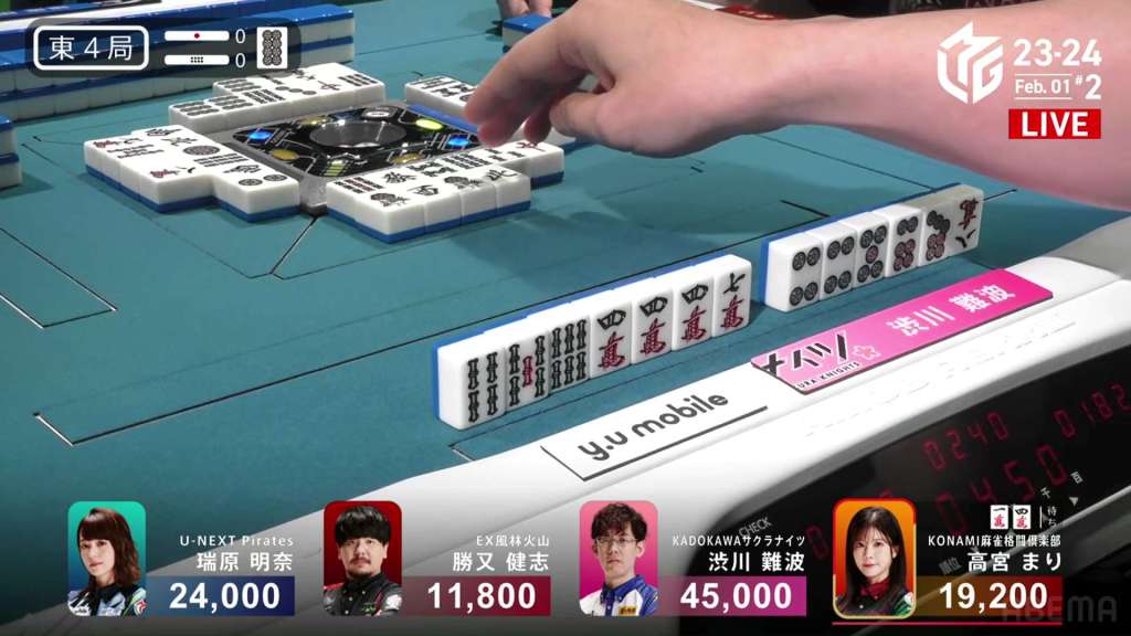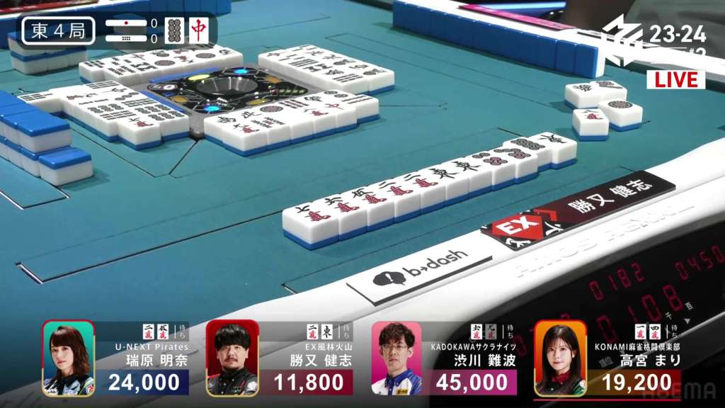 In E4-0, 4th place Katsumata, 3rd place Takamiya and 2nd place Mizuhara are all trying to catch up to 1st place Shibukawa. Every hand is an opportunity to make progress.