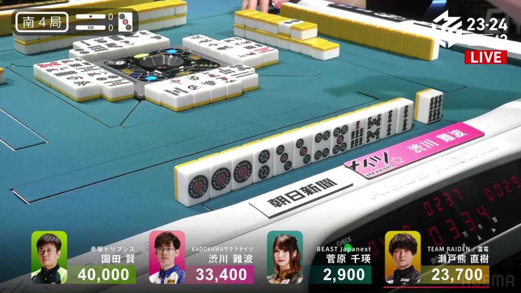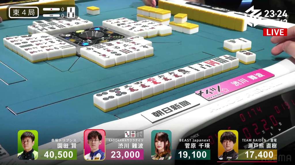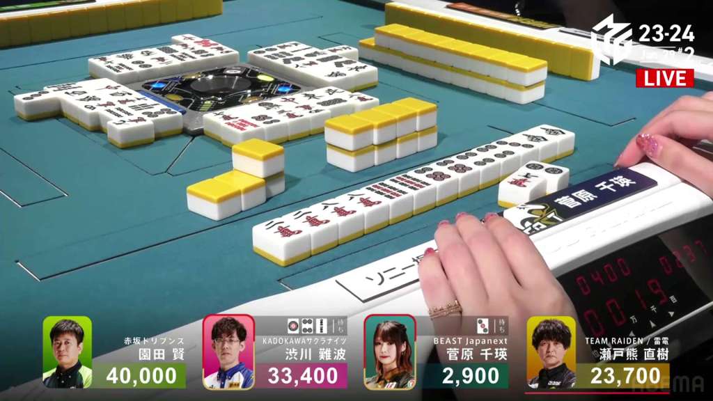 Immediately after, Sugawara draws her sixth pair and calls riichi on a 3p dora tanki. With two in Shibukawa’s hand and one in hers, that leaves only a single 3p in the wall. However, despite waiting on a single tile against Shibukawa’s 3-sided wait, mahjong will be mahjong. At the start of the third row, Shibukawa draws and drops that single 3p and deals into Sugawara. Hitting the uradora, Sugawara wins the hand with Riichi/Chiitoi/Dora 2/Ura 2 for 12,000 plus one riichi stick. Though it isn’t enough to get Sugawara out of 4th, it does bring Shibukawa down to 3rd place and Setokuma up to 2nd.