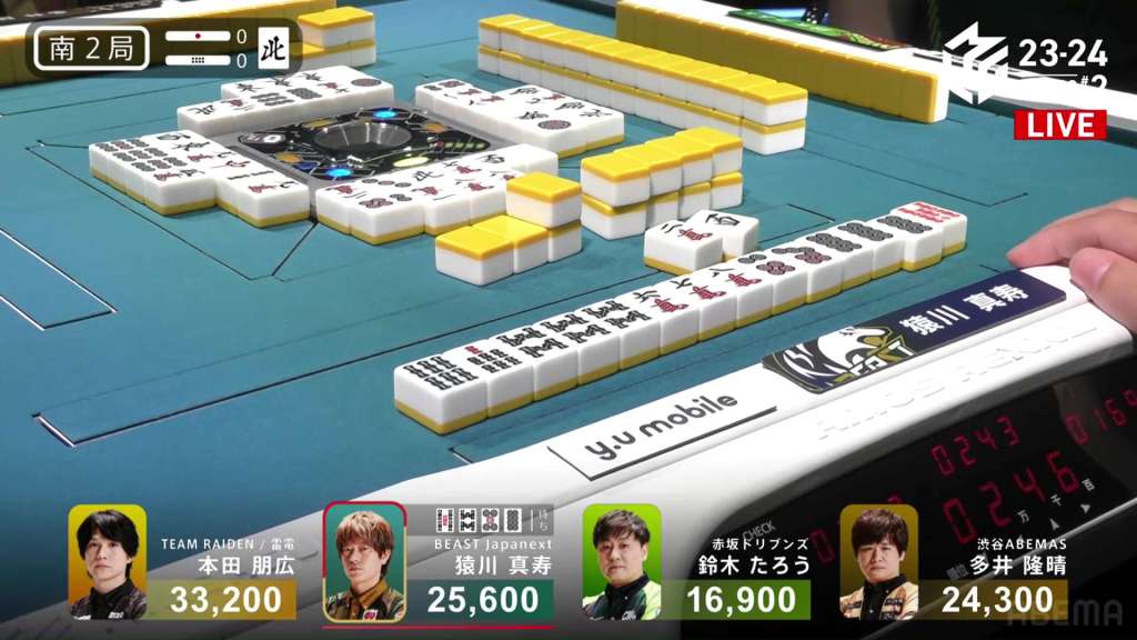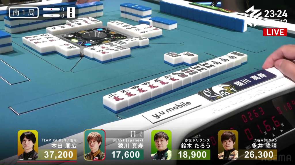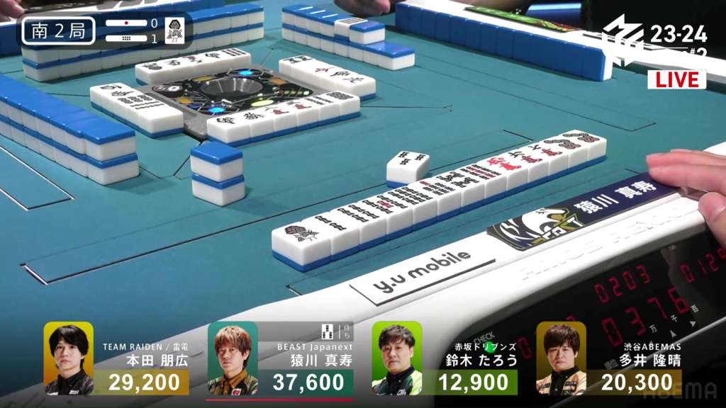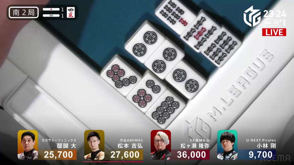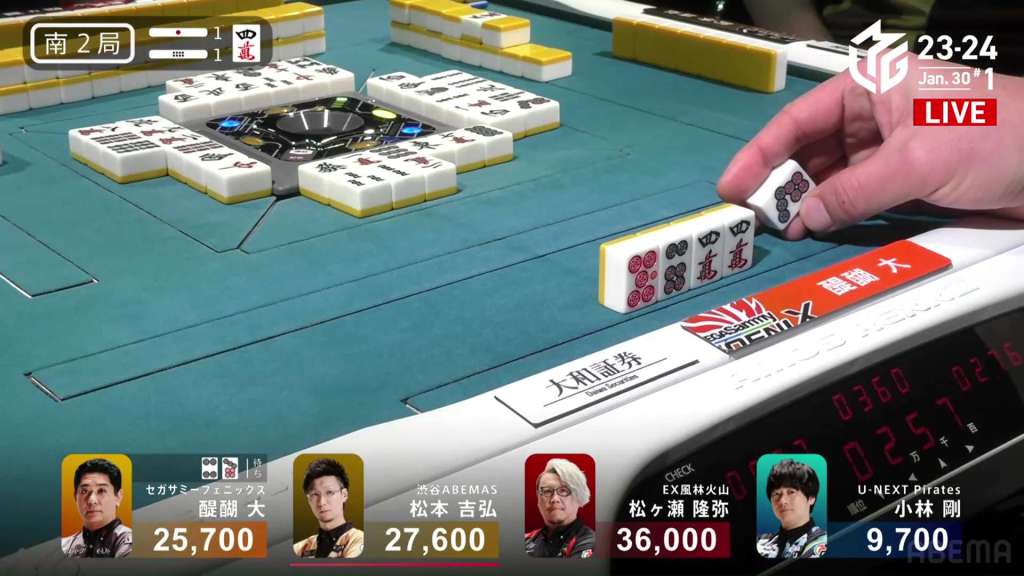 In S2-1, Daigo is in 3rd, 1,900 behind 2nd place dealer Matsumoto and 10,300 behind 1st place Matsugase. With 1,300 going to the next winner, a mangan tsumo will be enough to get him into 1st place.