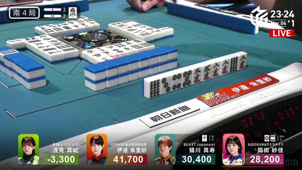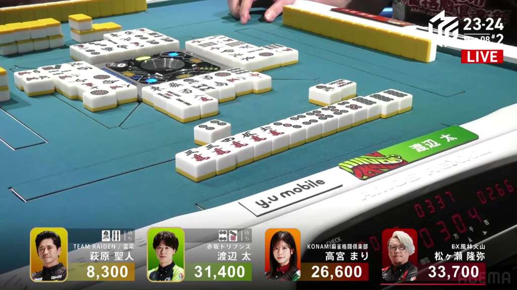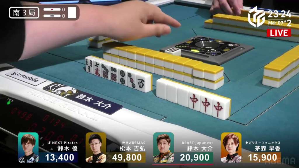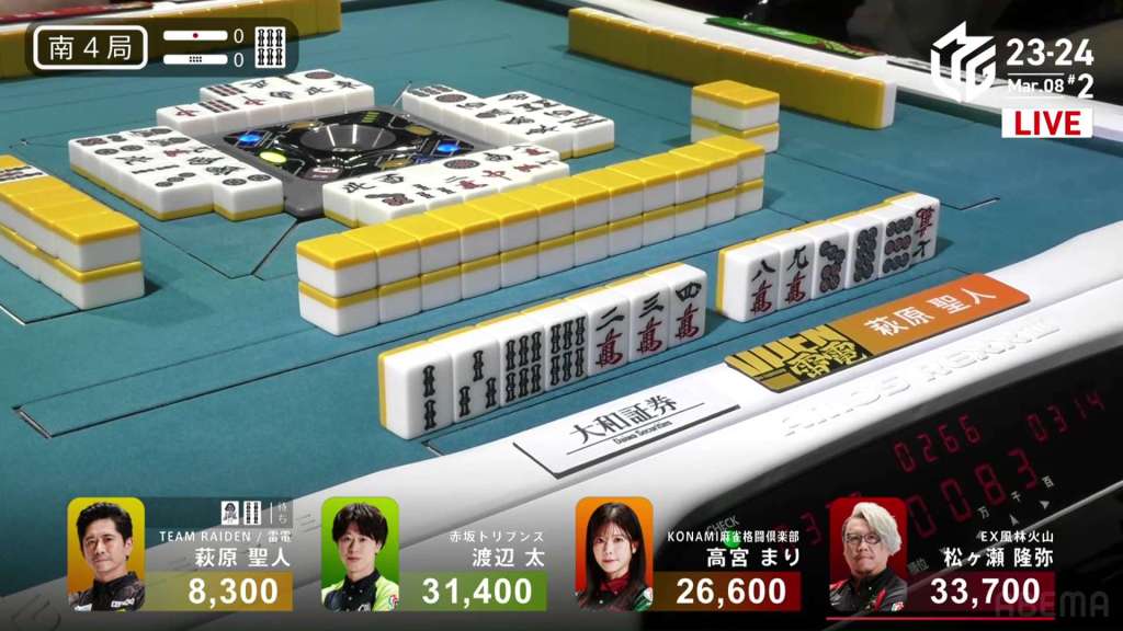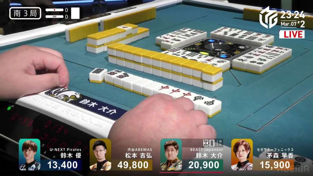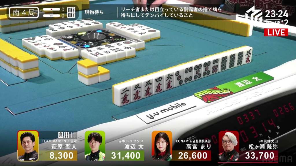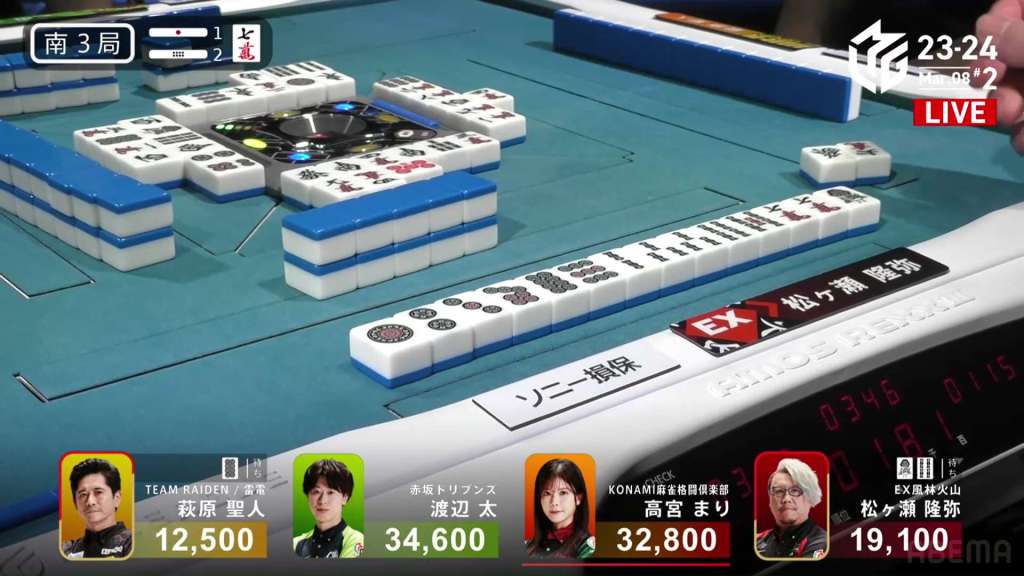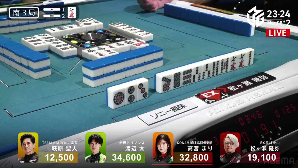 In S3-2, Matsugase is in 3rd place, 13,700 behind 2nd place Takamiya and 15,500 behind 1st place Futoshi. With a riichi stick and two honba on the table, a haneman tsumo would be enough to move into 1st place.