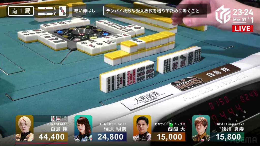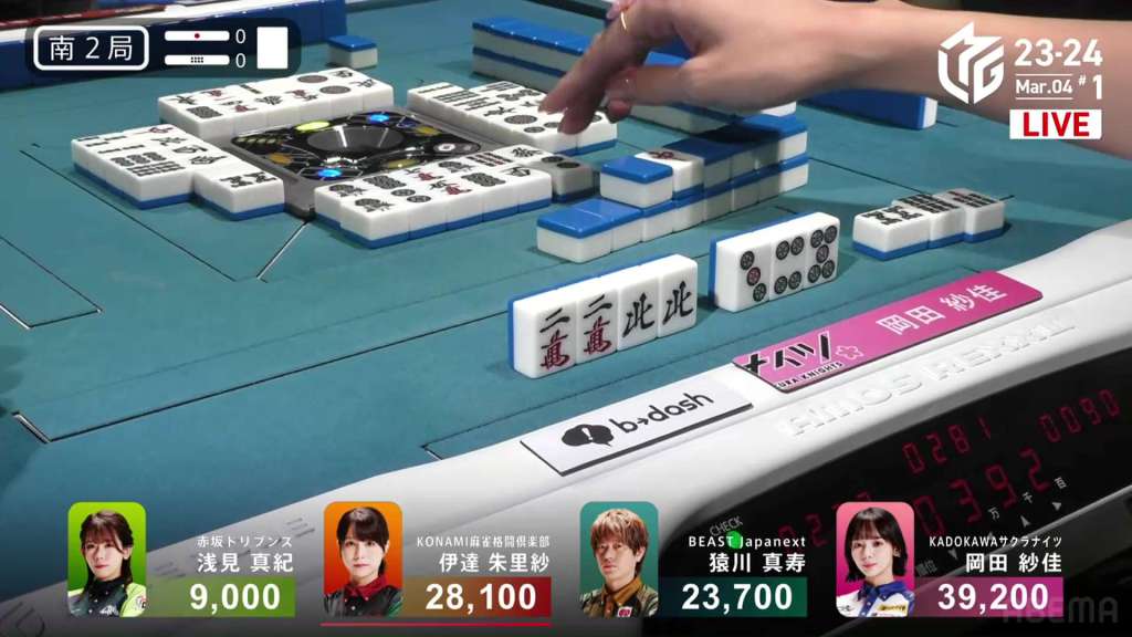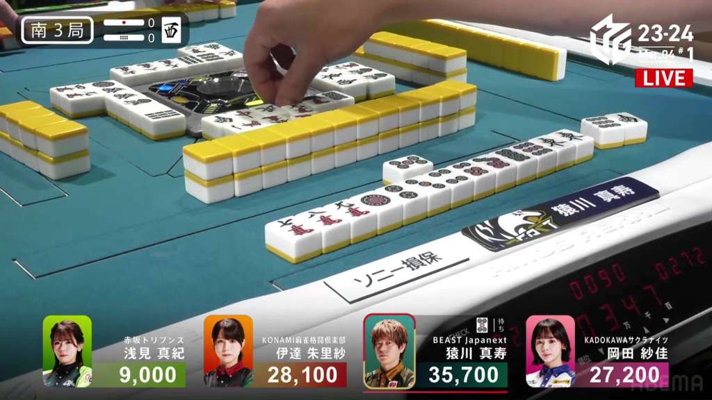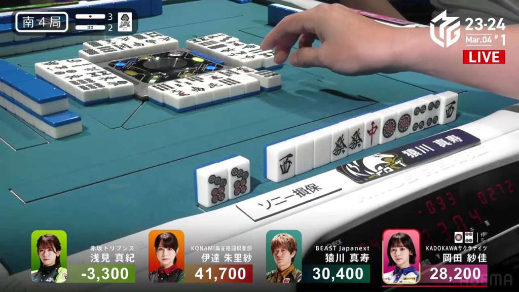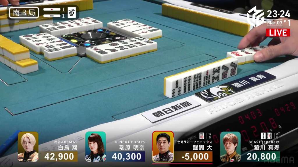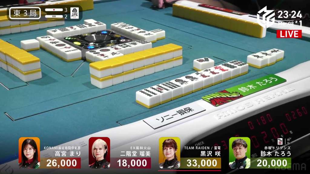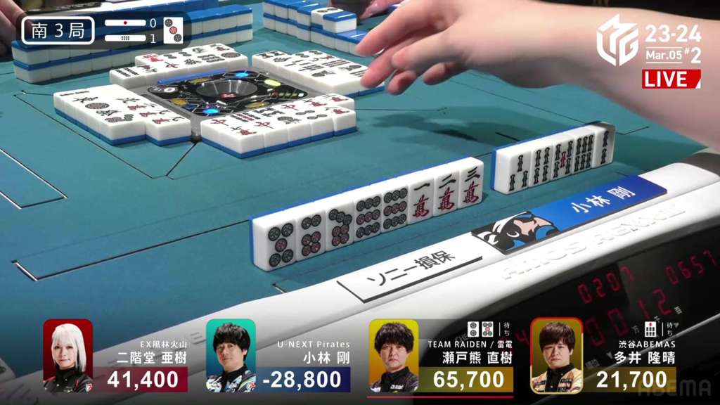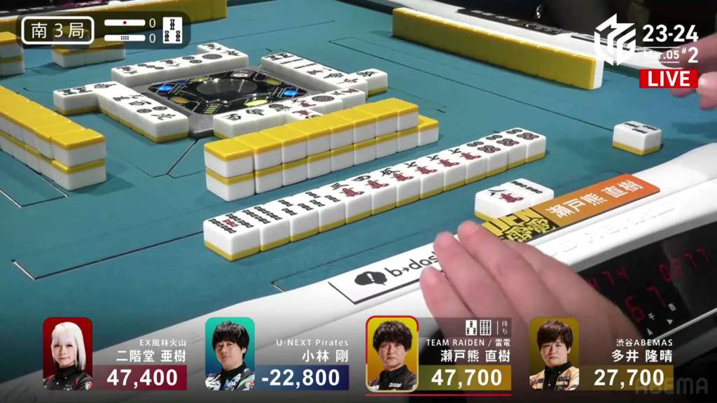 In S3-2, Matsugase is in 3rd place, 13,700 behind 2nd place Takamiya and 15,500 behind 1st place Futoshi. With a riichi stick and two honba on the table, a haneman tsumo would be enough to move into 1st place.