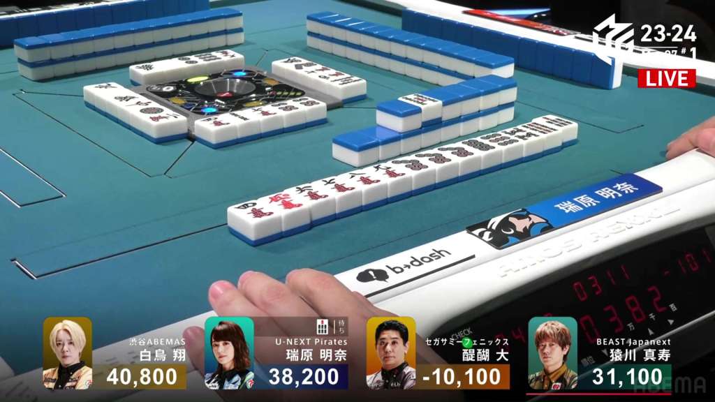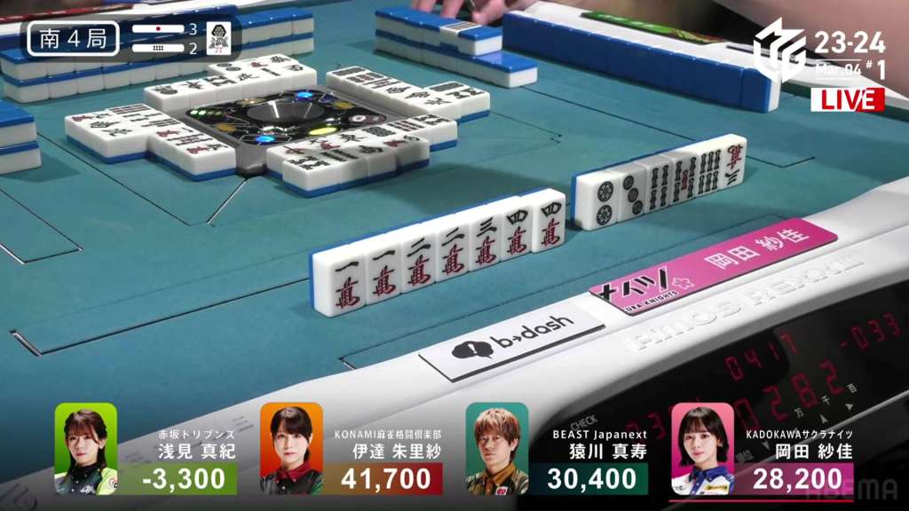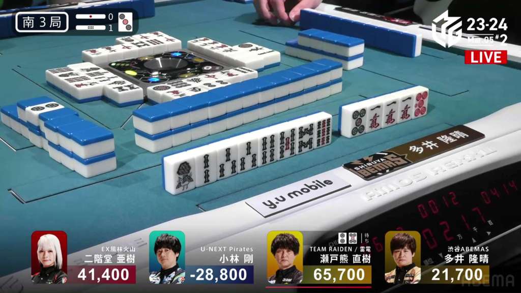 On Matsugase’s ippatsu turn, he draws the last 1s in the wall and wins the hand. Matsugase wins with Riichi/Ippatsu/Tsumo/Pinfu/Dora 2 for 3,000+100/6,000+100 plus two riichi sticks to move into 1st place going into the last hand.