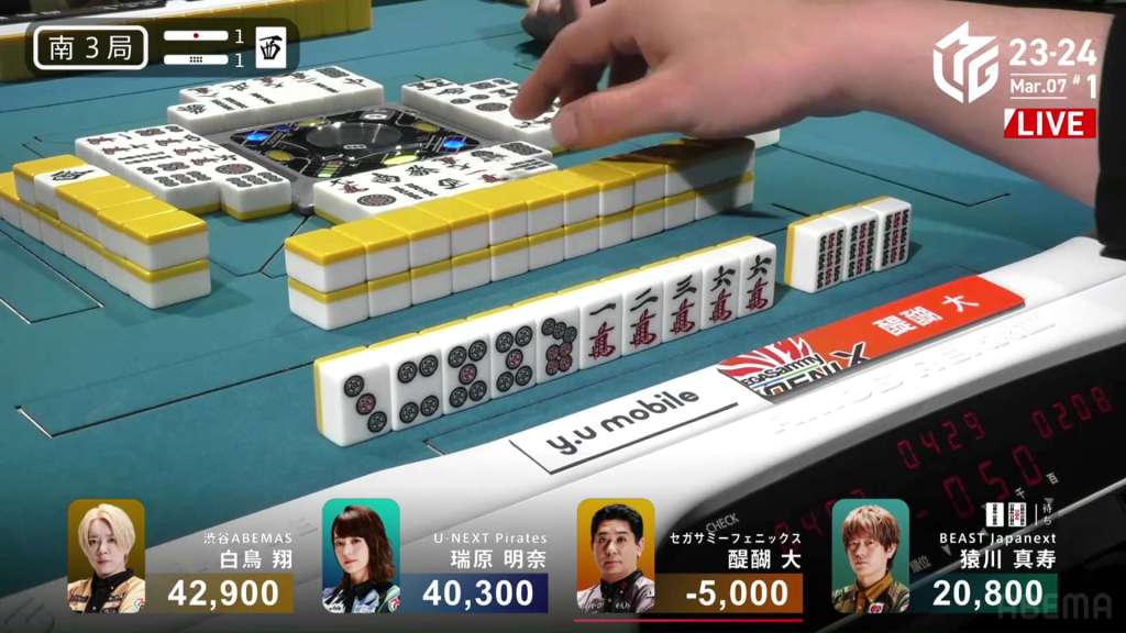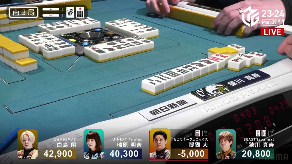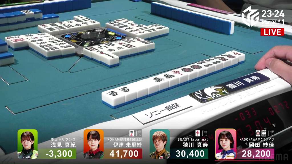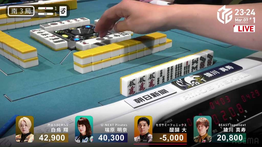 On Sarukawa’s next draw, he gets the red dragon and wins the hand. Sarukawa wins with Tsumo/Honitsu/Chiitoi for 3,000+200/6,000+200 plus four riichi sticks, taking the game and moving his team up into 7th place in the standings.