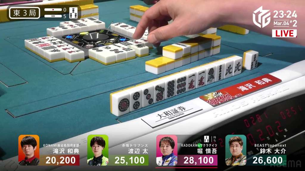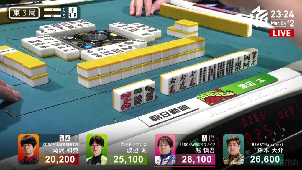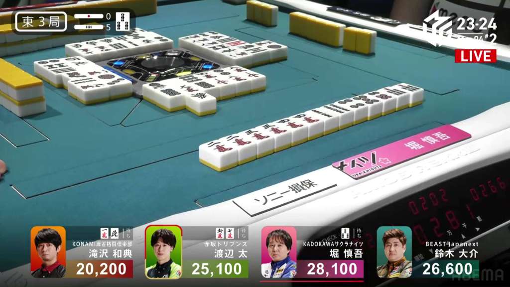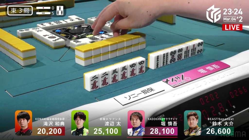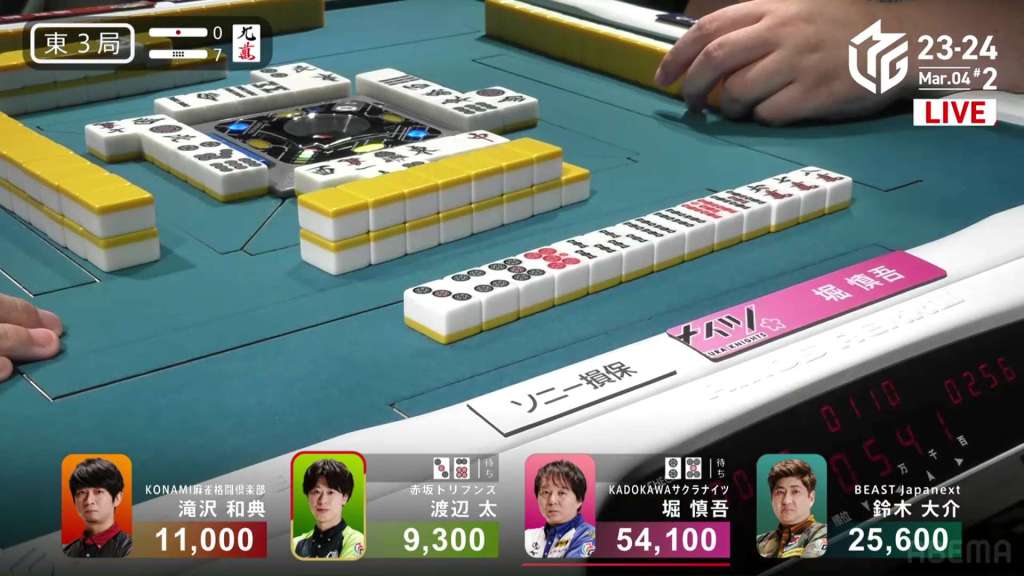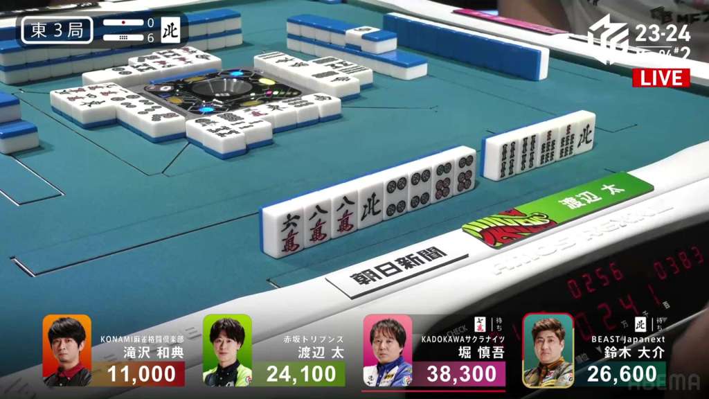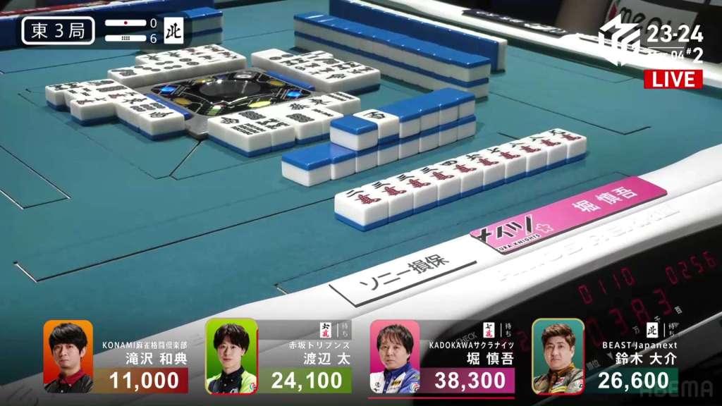 In E3-4, Hori is the dealer in 3rd place and 4,200 behind 1st. After the previous two hands went to a draw, there are now three riichi sticks and four honba on the table, giving the next winner exactly 4,200 in bonus sticks.