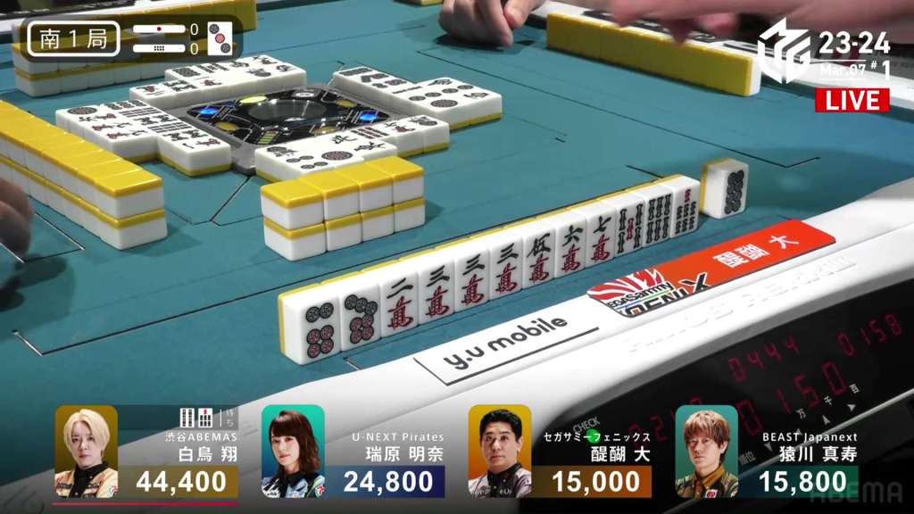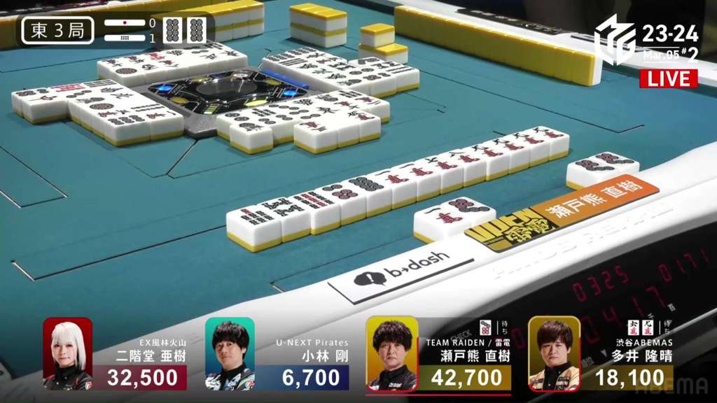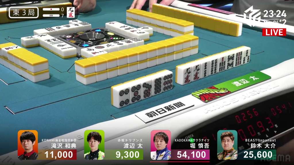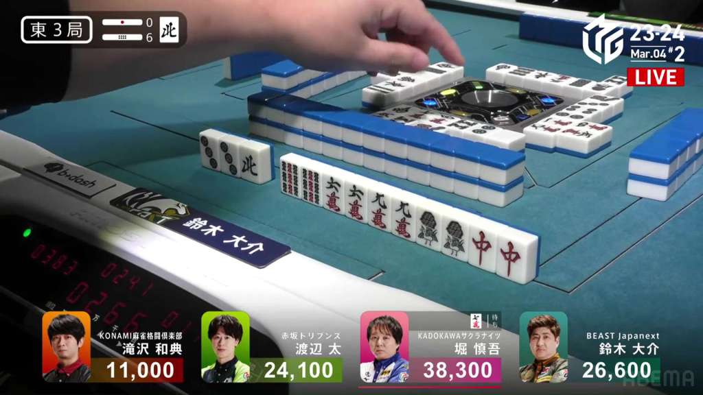 To Hori’s right in 2nd place Daisuke aiming for chiitoi. In the middle of the second row, Daisuke gets to tenpai and calls riichi on a north dora tanki, guaranteed at least a mangan if he wins.