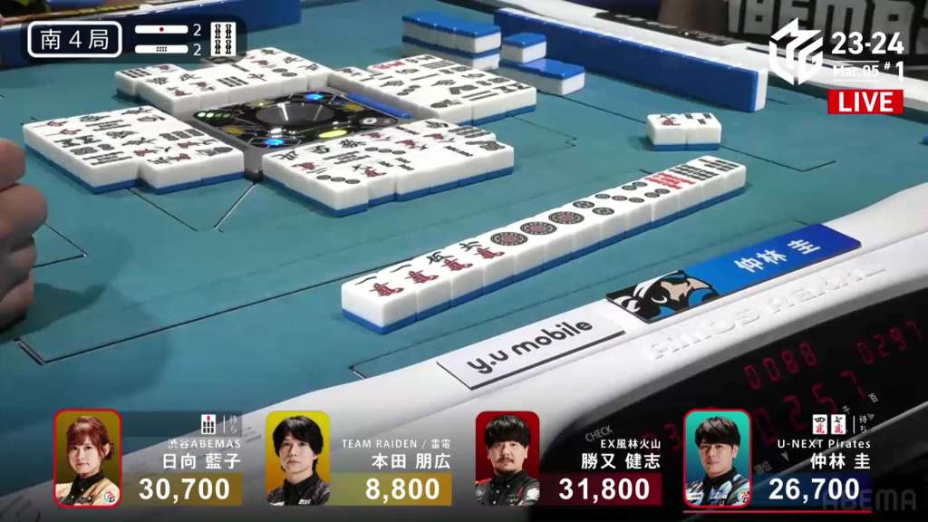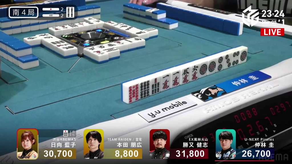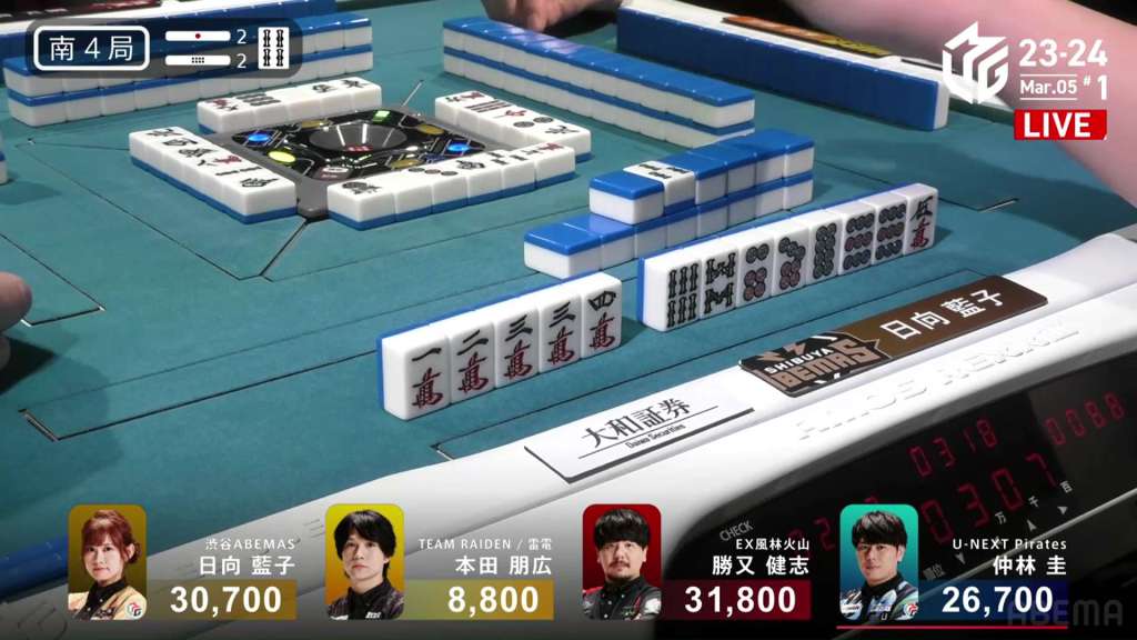 In S4-2, Nakabayashi is the dealer in 3rd place, 4,000 behind 2nd place Hinata and 5,100 behind 1st place Katsumata. With two riichi sticks and two honba on the table, a simple 2 han hand would be enough to move into top spot.