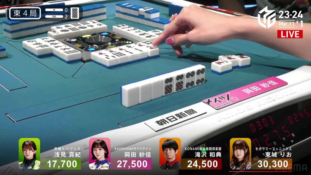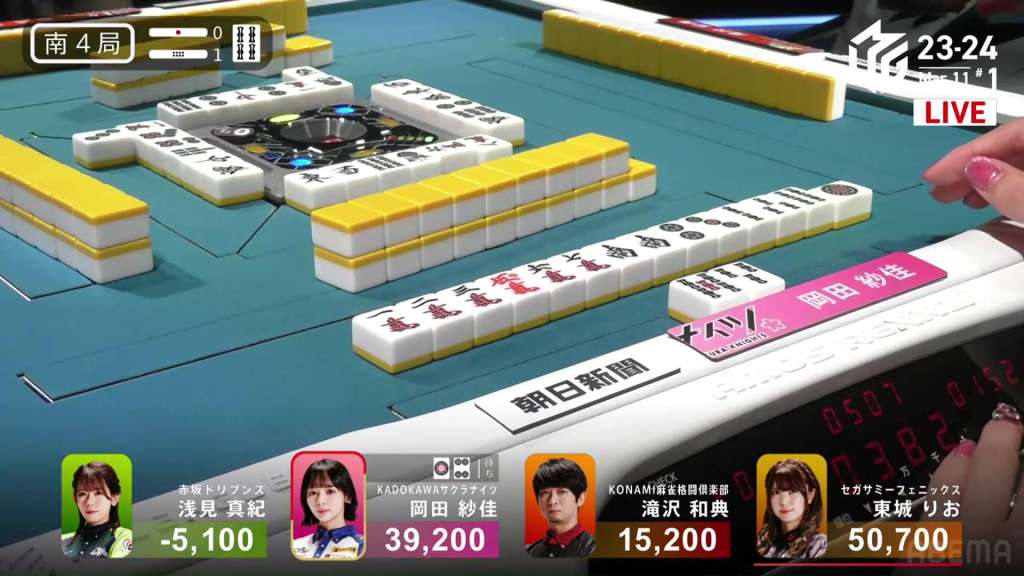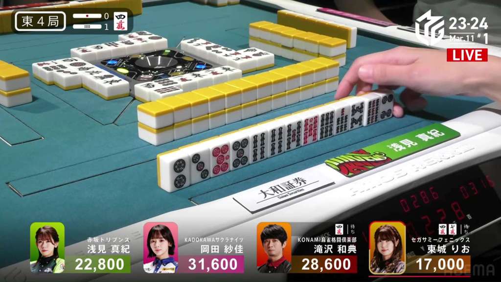 With the stray honours in Okada’s hand, she is able to keep pushing. After drawing a 5m and calling pon soon after on the red 5m, Okada gets to iishanten. Like many of the hands before, Asami joins in on the riichi fun and calls riichi on a 69m ryanmen.