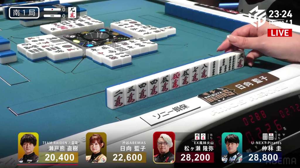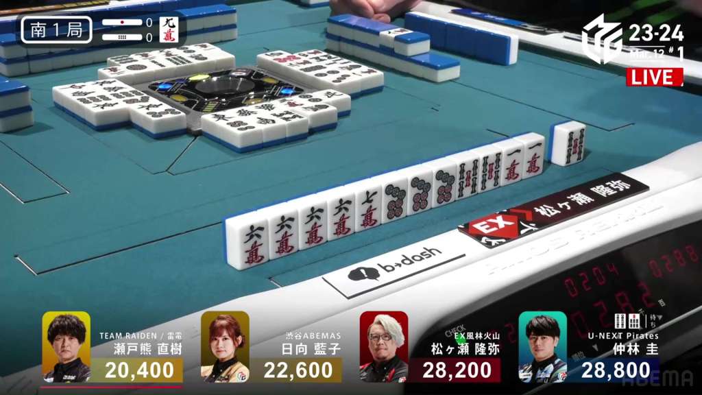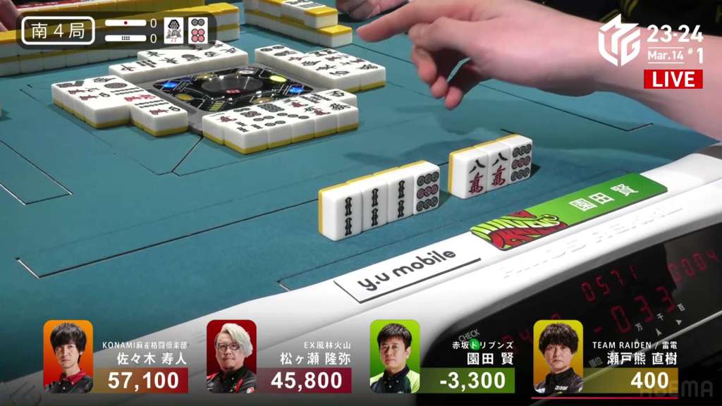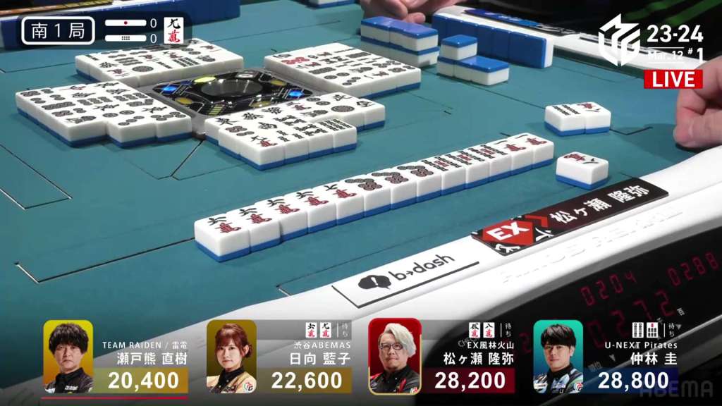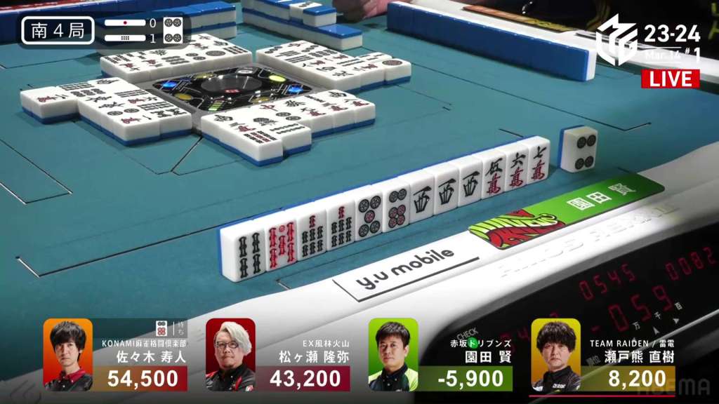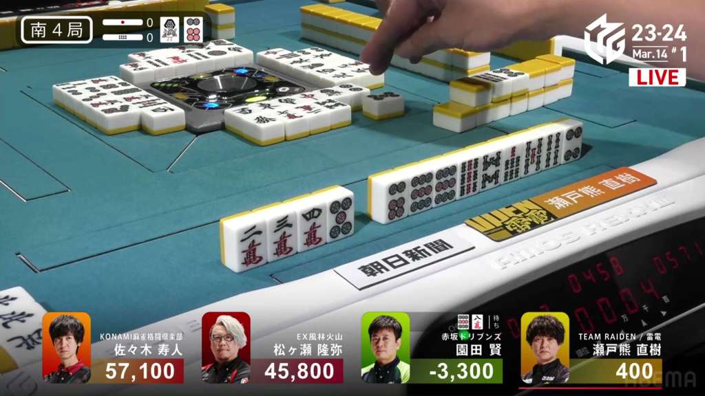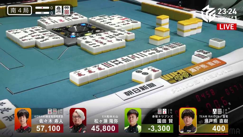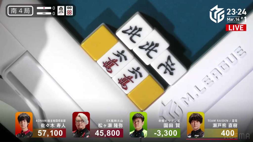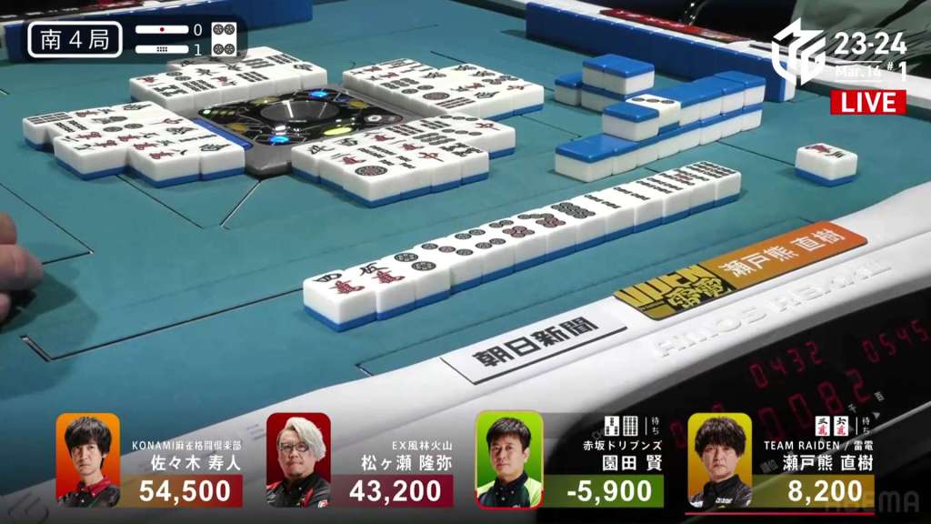 In S4-0, Setokuma is the dealer in 3rd place, 3,700 ahead of 4th place Sonoda and 41,400 behind 2nd place Matsugase. Though 2nd place is quite a ways off, getting any points now will help Team Raiden in their pursuit of a playoff spot.