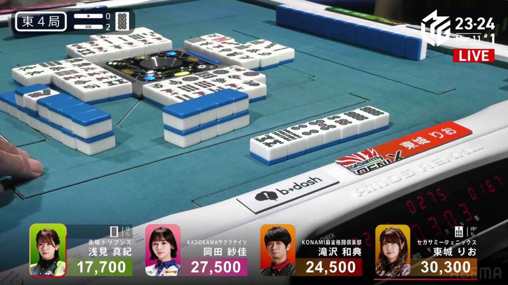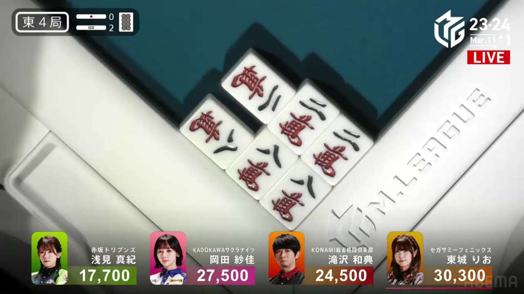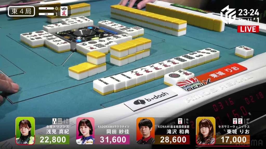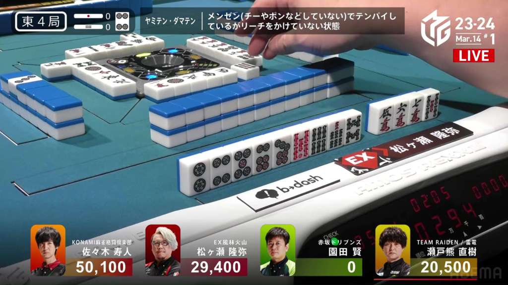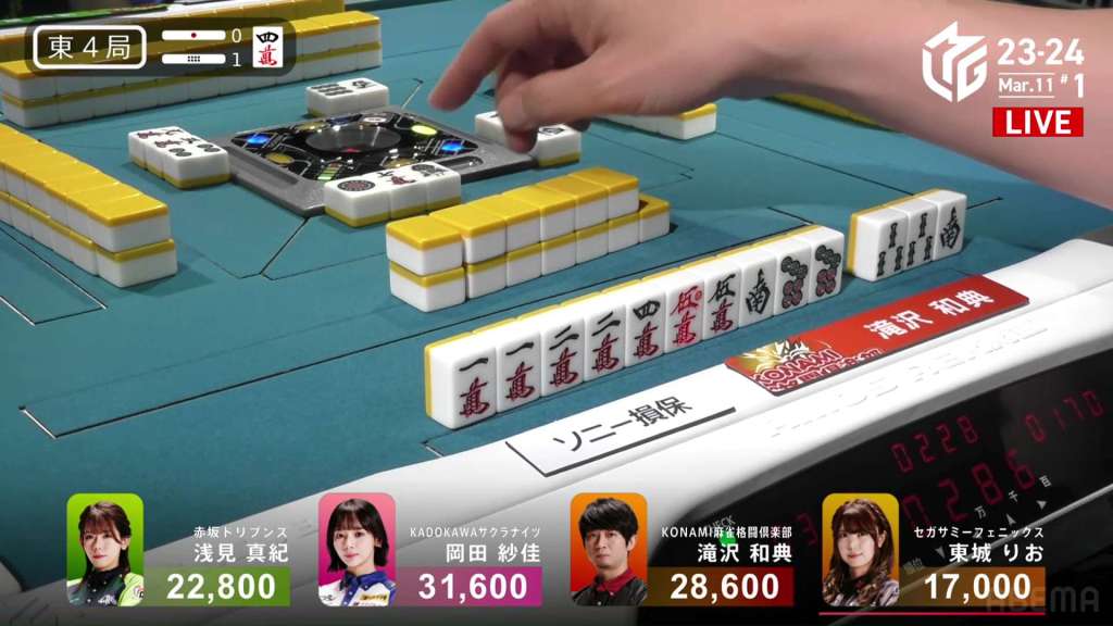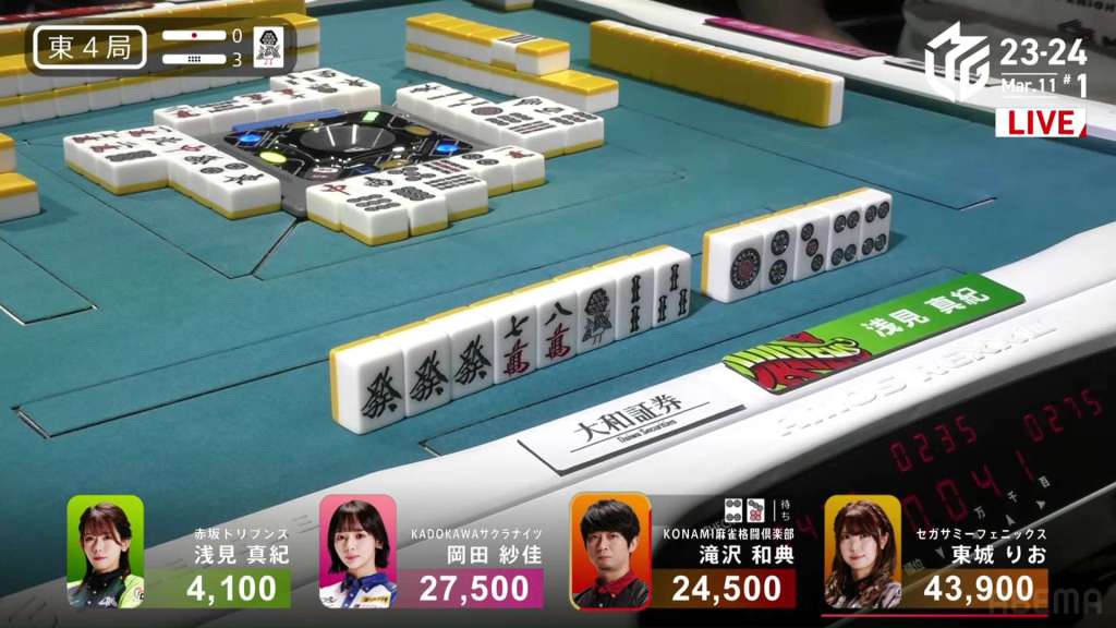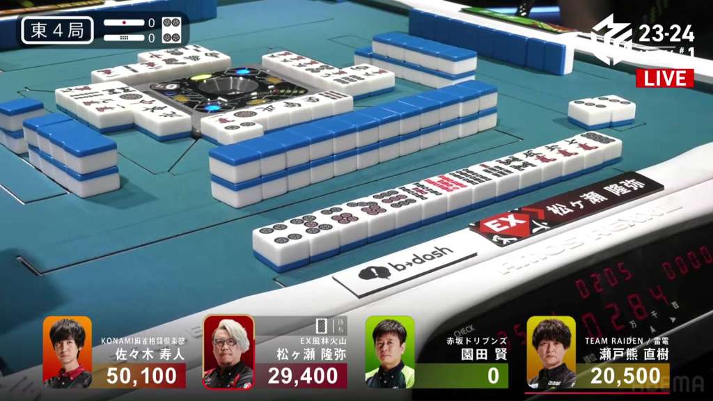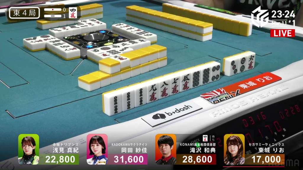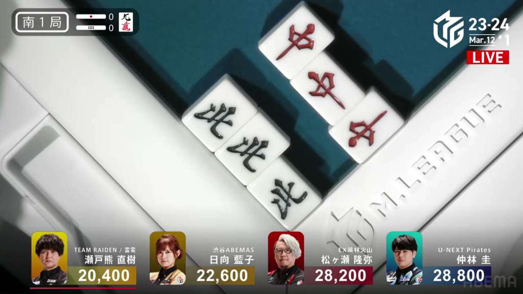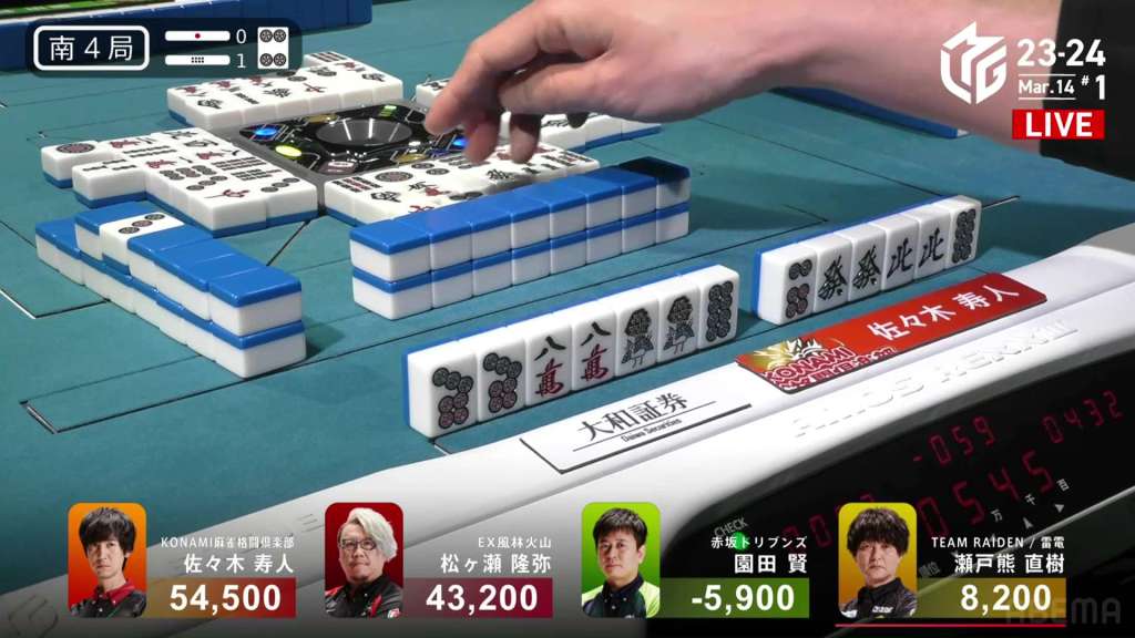 In S4-0, Setokuma is the dealer in 3rd place, 3,700 ahead of 4th place Sonoda and 41,400 behind 2nd place Matsugase. Though 2nd place is quite a ways off, getting any points now will help Team Raiden in their pursuit of a playoff spot.
