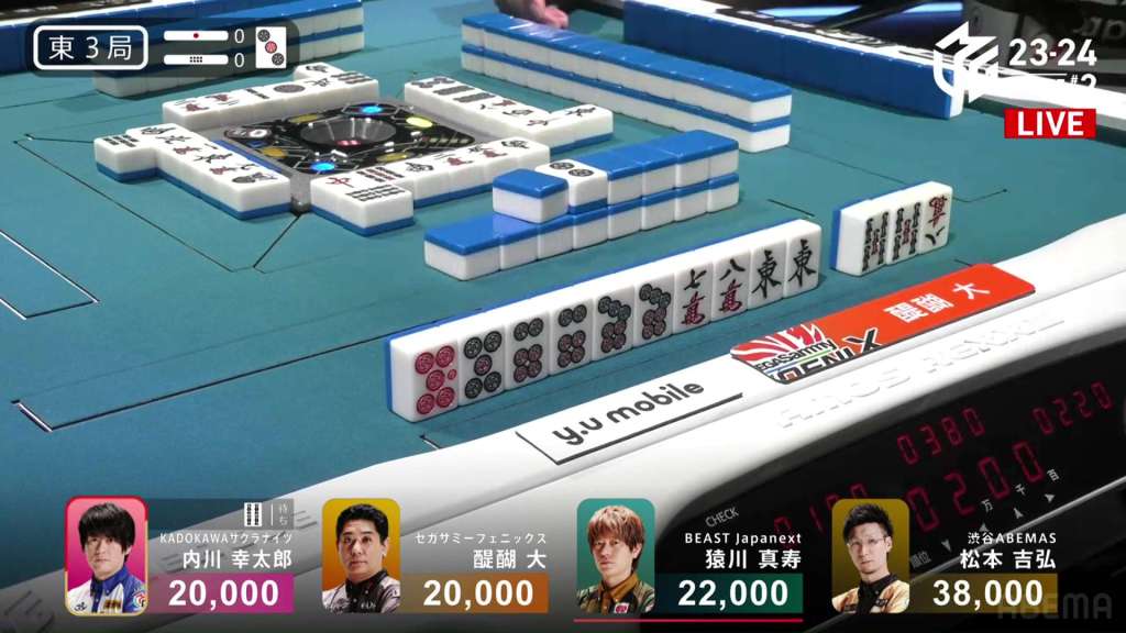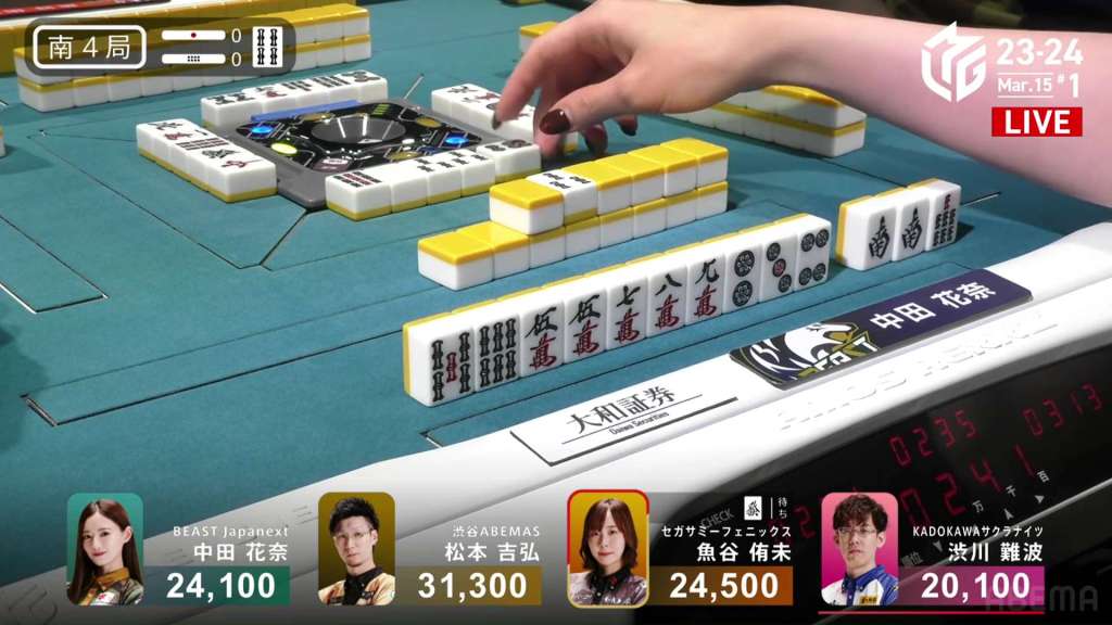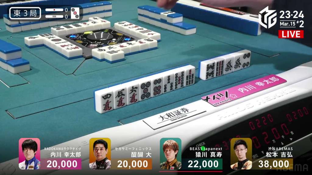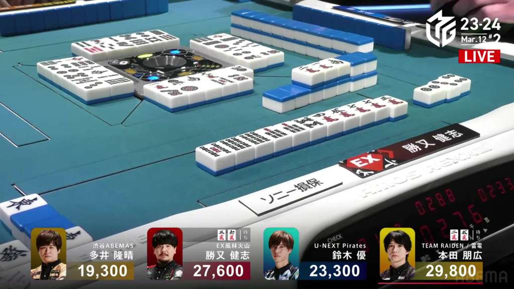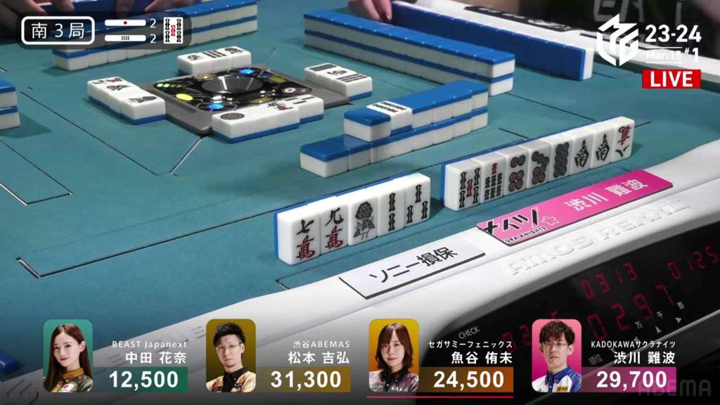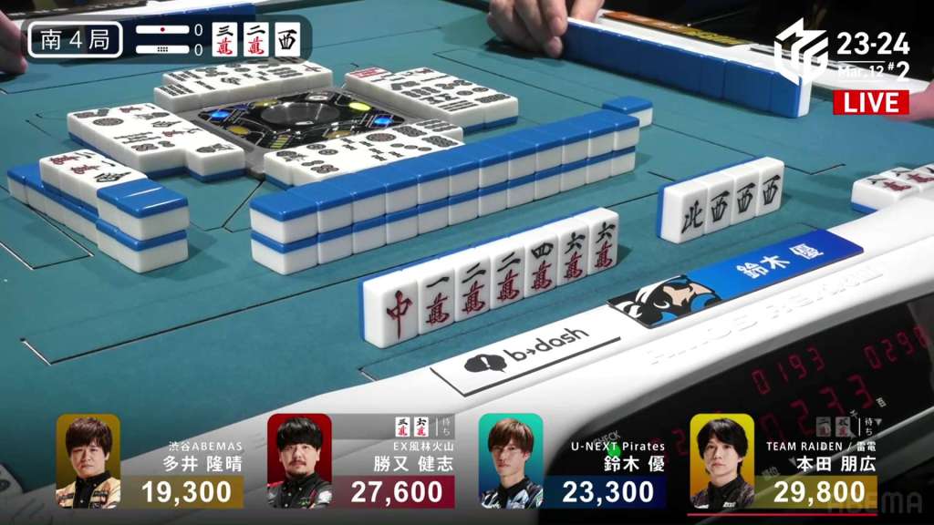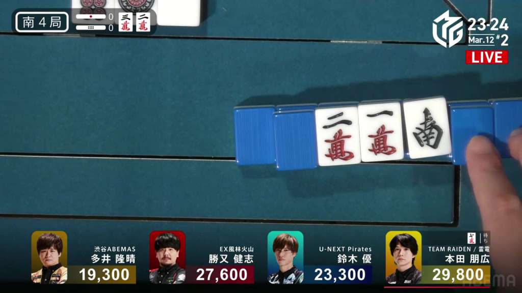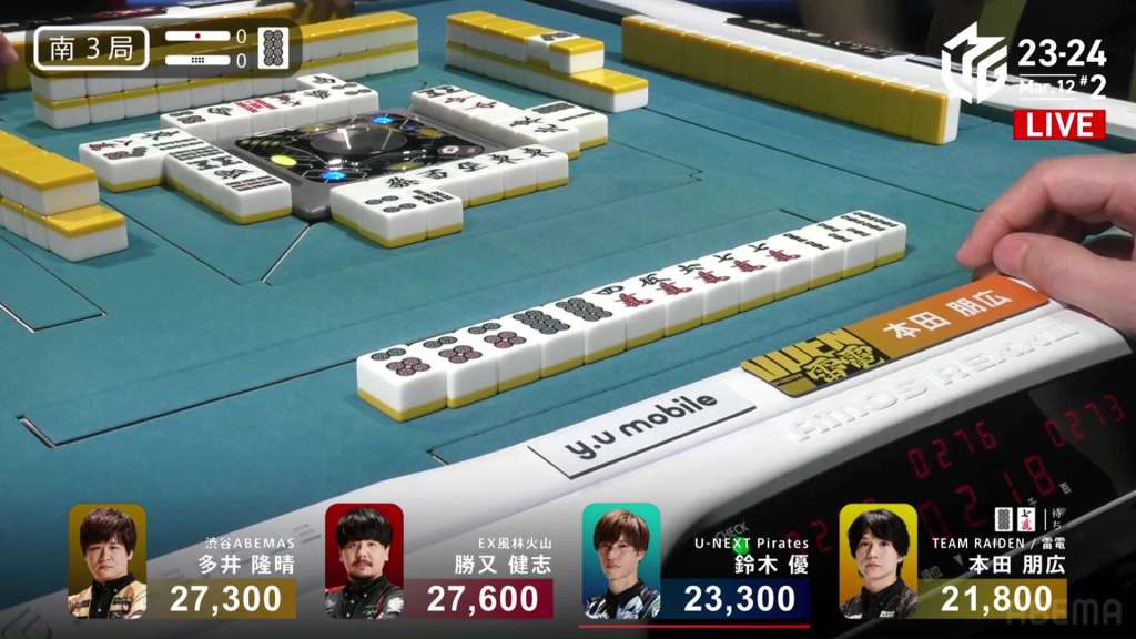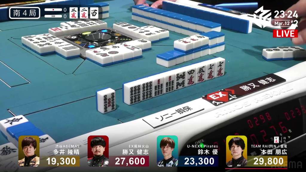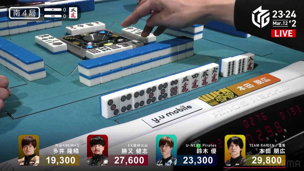In S3-0, the game has been very quiet so far. The biggest hand won so far was 2,700. With just these small shifts, 4th place Honda is just 5,800 behind 1st place Katsumata.