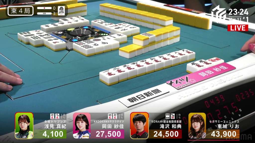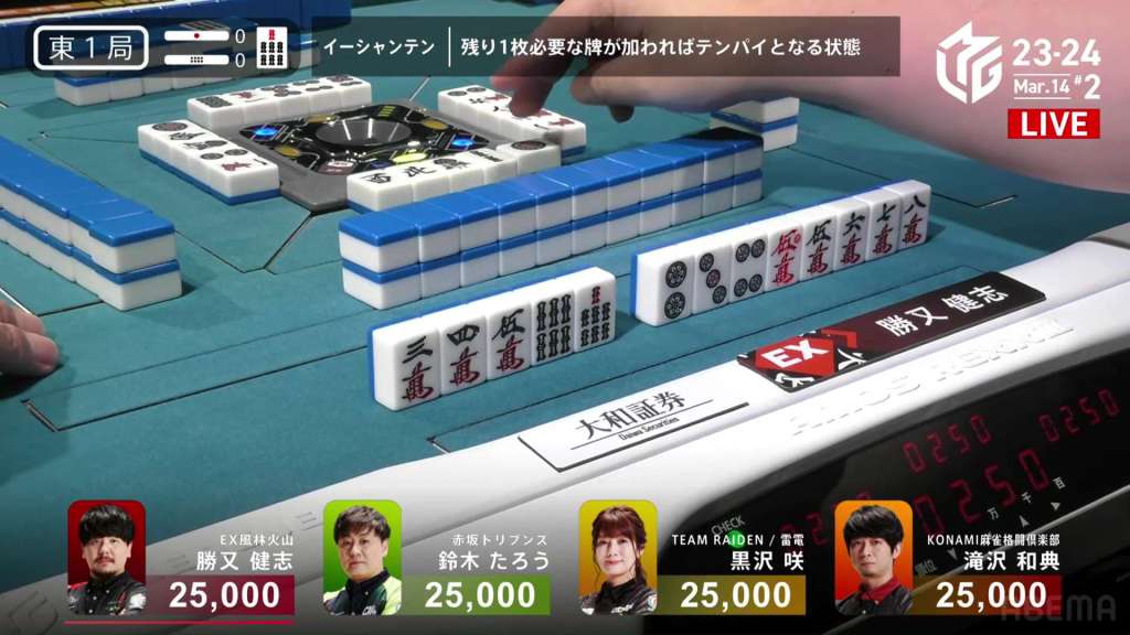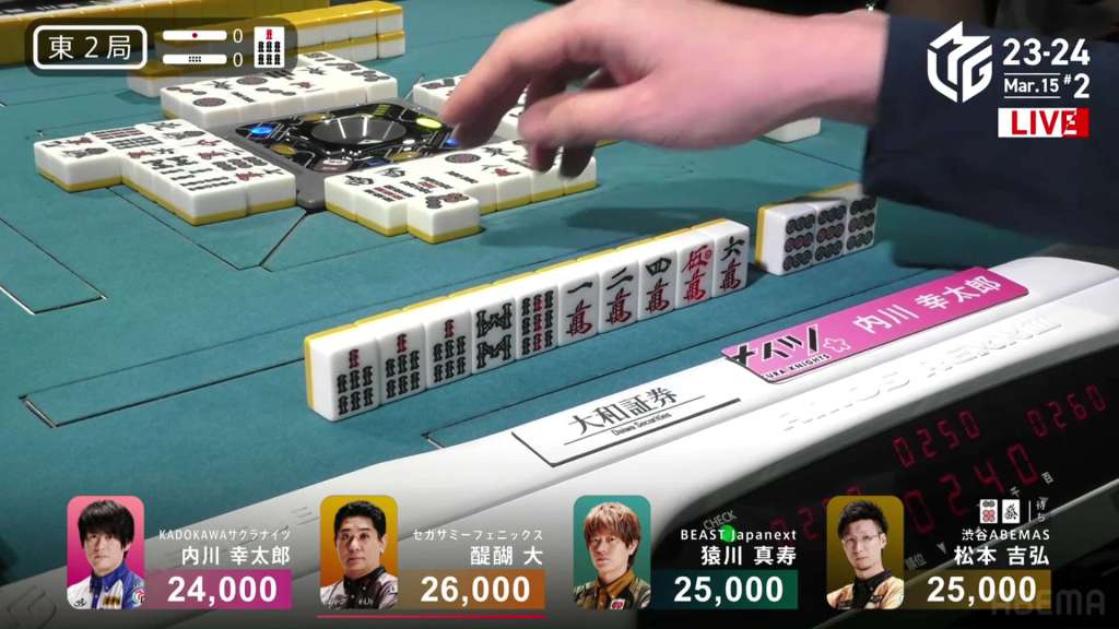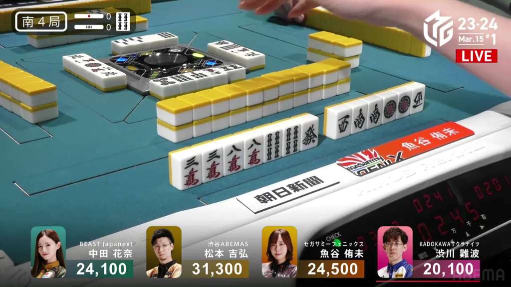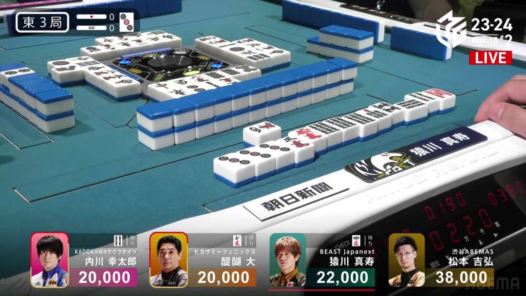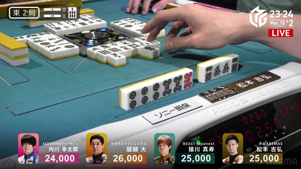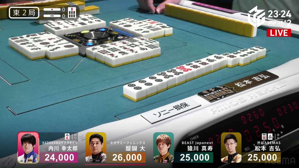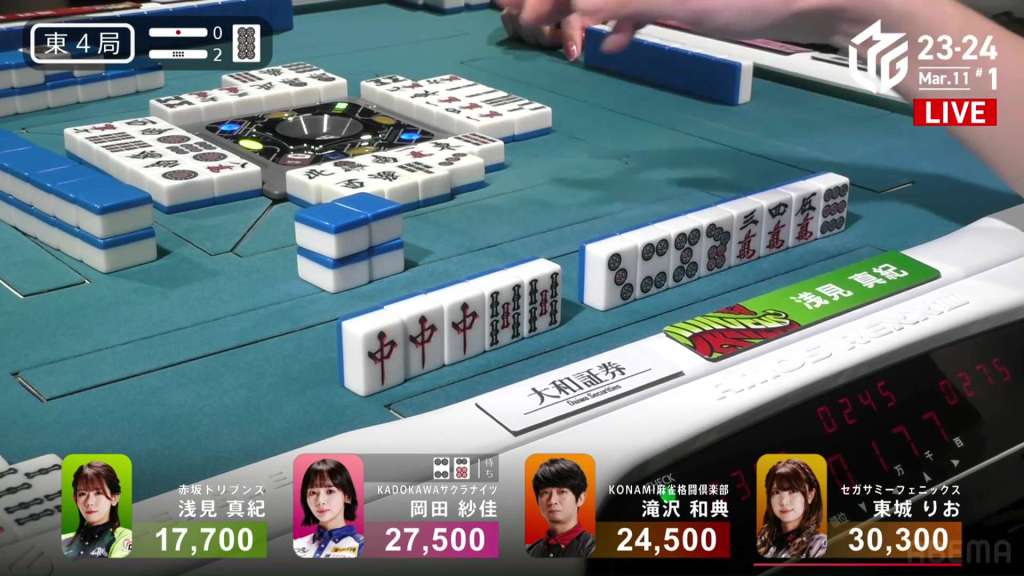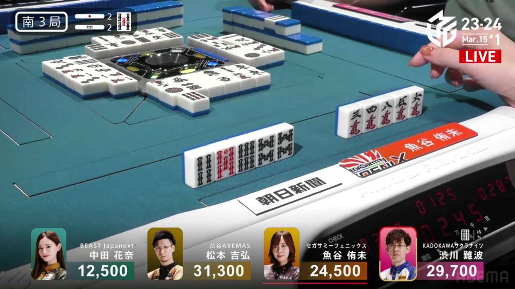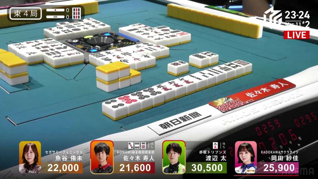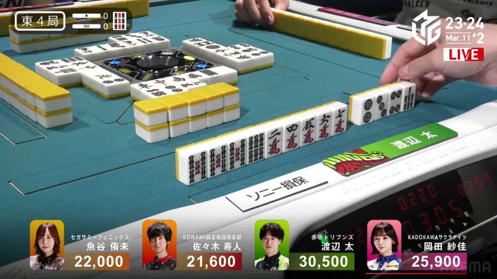 In S3-0, the game has been very quiet so far. The biggest hand won so far was 2,700. With just these small shifts, 4th place Honda is just 5,800 behind 1st place Katsumata.