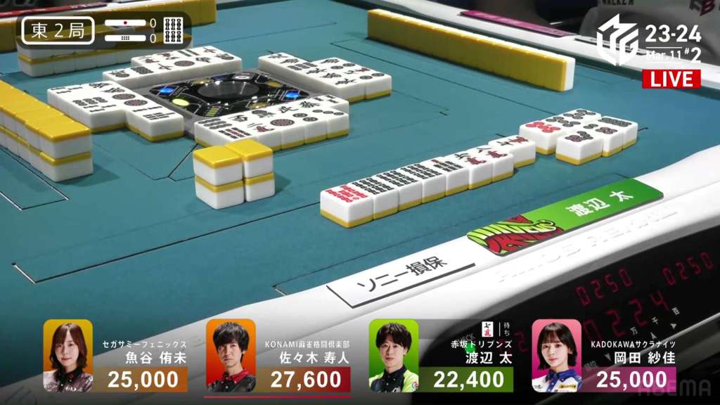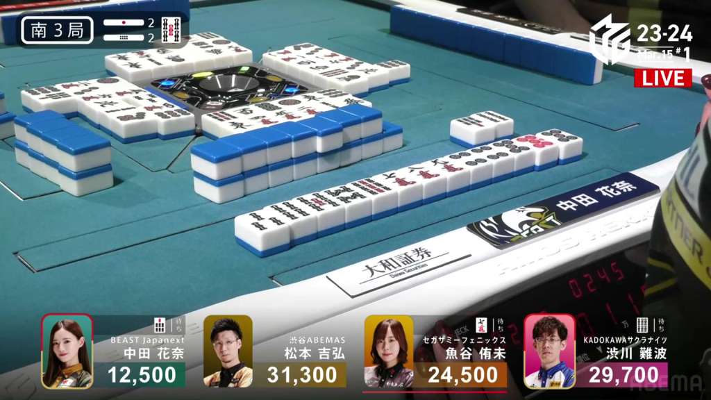 In S3-2, Nakada is is in 4th place, 12,000 behind 3rd place dealer Uotani, 17,200 behind 2nd place Shibukawa and 18,800 behind 1st place Matsumoto. With two riichi sticks and two honba on the table, Nakada needs a limit hand to be able to move up a rank.