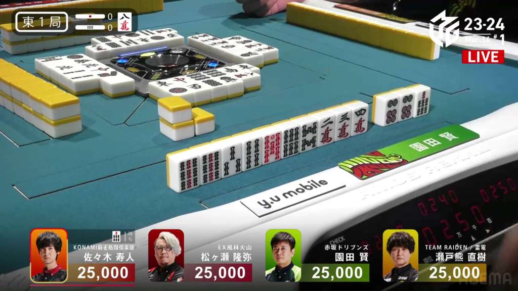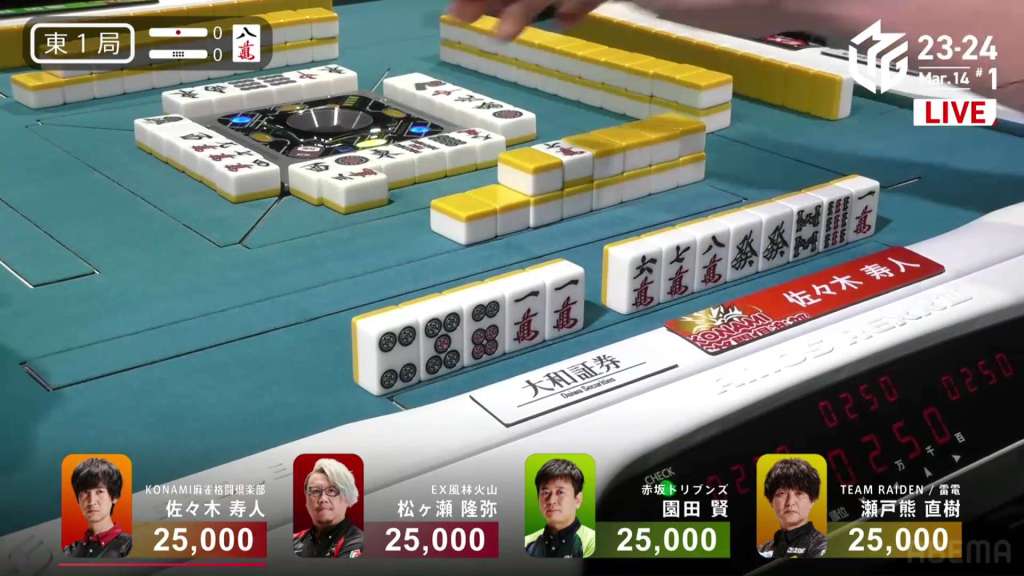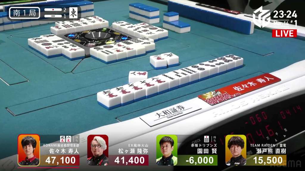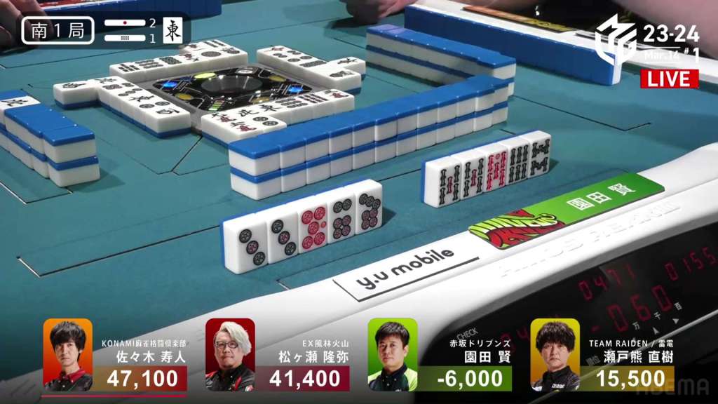 In S1-1, Hisato is back in the dealer seat and needing to defend his 5,700 lead over 2nd place Matsugase. There is 2,300 in bonus sticks on the table waiting for the next winner.