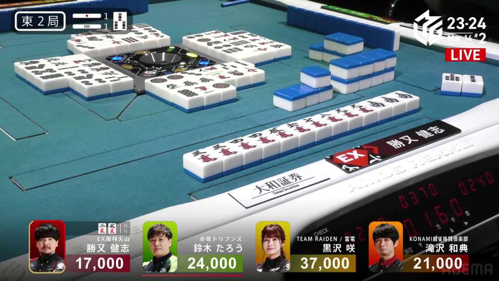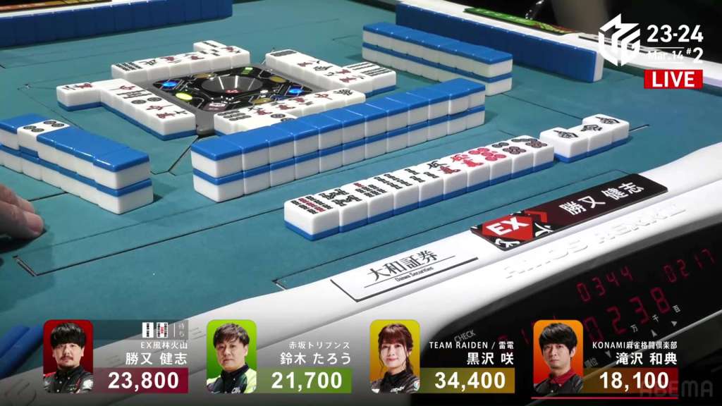 Katsumata starts out the hand already iishanten, having the choice to aim for a very close manzu honitsu. After drawing a manzu on turn 2, he dives headfirst for the more valuable prospect. On turn 4, Katsumata gets to tenpai and calls riichi on a 25m ryanmen, with the 5m giving iipeikou. With the early riichi, nobody has the appetite to push extremely hard against it. However, hands started to develop naturally. By the middle of the third row, all three of his opponents are at iishanten. Near the end of the hand, Kurosawa gets to tenpai, but has to throw the 2m dora to take it. With Team Raiden at the bottom of the standings, she discards it and tries to call riichi and deals into Katsumata. Katsumata wins the hand with Riichi/Honitsu for 8,000+300 plus one riichi stick, bringing him up to 2nd place and just 2,400 behind Kurosawa.