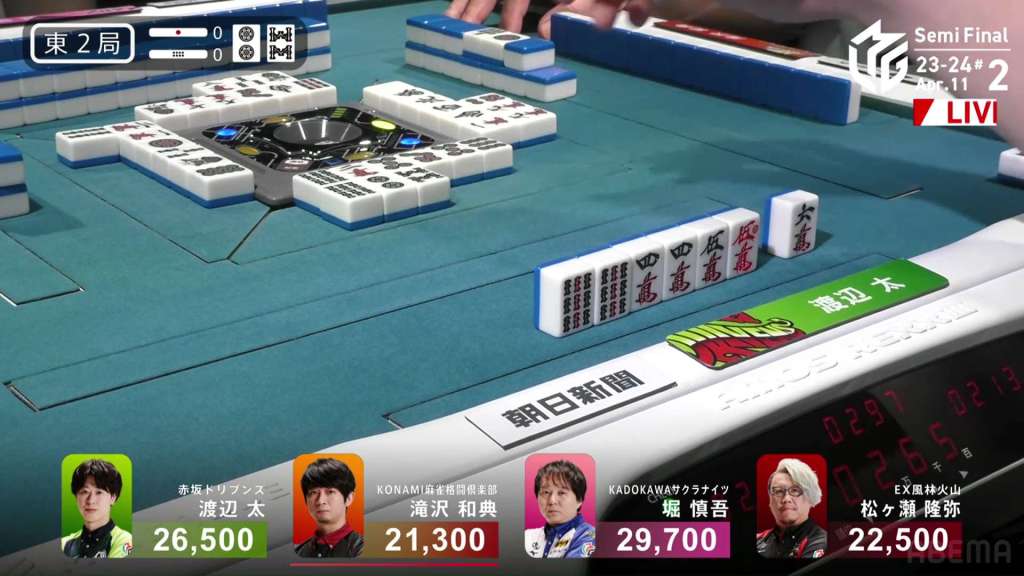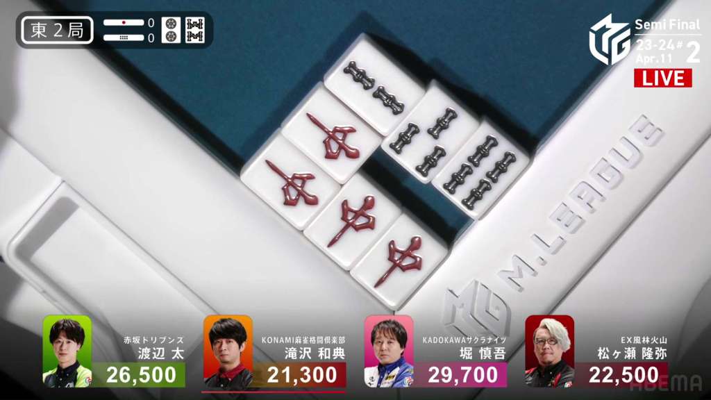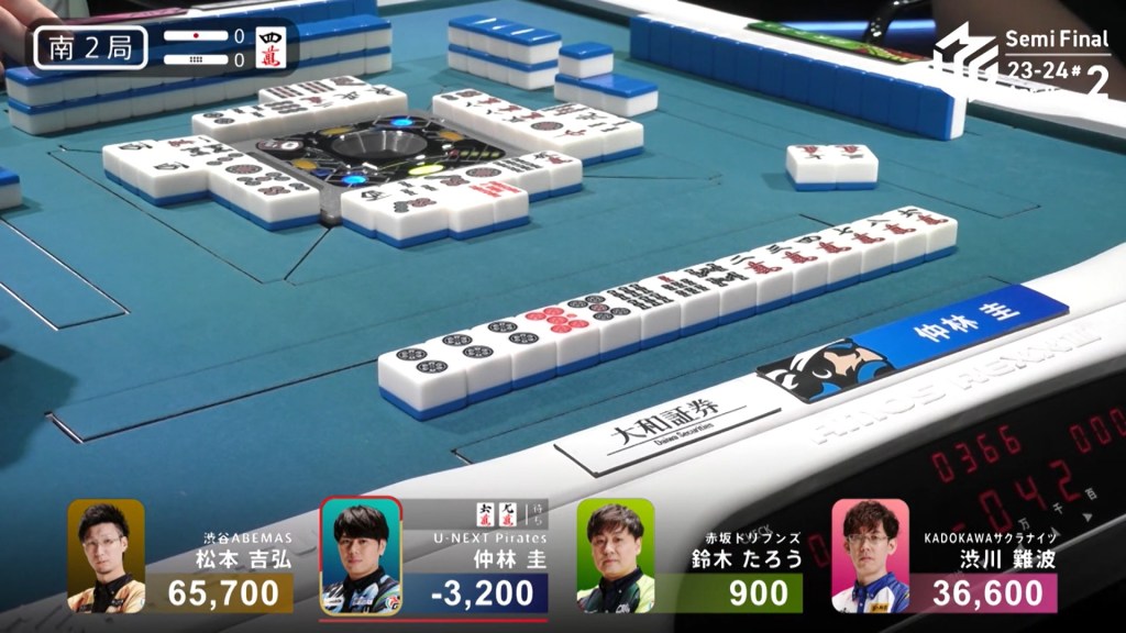 With the riichi by Matsugase, Futoshi’s winning conditions have changed. Now Futoshi is allowed to win on the 6m by ron and move into 1st place. Near the end of the second row, Futoshi draws the takame 6m and wins the hand. Futoshi wins with Riichi/Tsumo/Tanyao/Dora 1/Ura 1 for 2,000/4,000 plus one riichi stick, giving the Akasaka Drivens their first semifinals win since March 20, 2021.