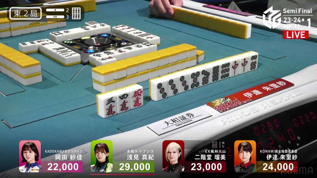 In E2-3, Date is playing for the Konami Mahjong Fight Club after not playing since March 4. She is sitting in 2nd place and 5,000 behind 1st place dealer Asami. With the first three hands going to a draw, there are now 2 riichi sticks and 3 honba waiting to be won by the next winner.