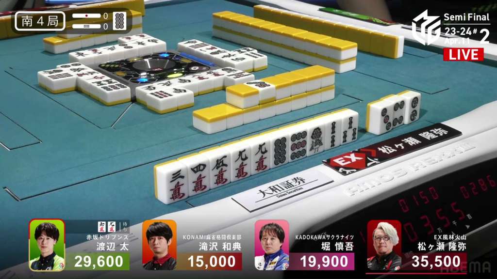 In S4-0, Matsugase is in 4th place and 11,300 behind 3rd place dealer Mizuhara. This is his last chance to Matsugase to make ground and stop the EX Furinkazan from falling further into 6th place. To get to 3rd place, he needs a 3/50 direct hit, a mangan tsumo or a haneman ron.