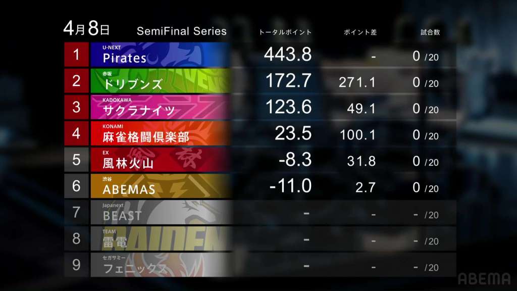 Finally, we have the Kadokawa Sakura Knights. After struggling in last season’s semifinals, the Kadokawa Sakura Knights continue to struggle. Uchikawa didn’t deal in during the taem’s first semifinal game, but he still ended up last. Okada dealt into last place while she was in riichi and ended up falling into 4th place herself. With neither Shibukawa nor Hori being able to get a 1st, the team ended up with a 0/1/1/2 record and a -104.8pts loss, moving them all the way down to 6th place.