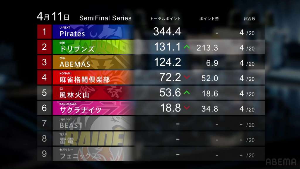 Going to the droppers, we have the Akasaka Drivens. In their first three games, the team wasn’t able to gain a single point. Then, on Thursday’s second game, Futoshi was able to move into top spot in the last hand to get the Akasaka Drivens their first semifinals win in almost three years. They had a 1/0/2/1 record with a -41.6pts drop, but they still hold onto 2nd place.