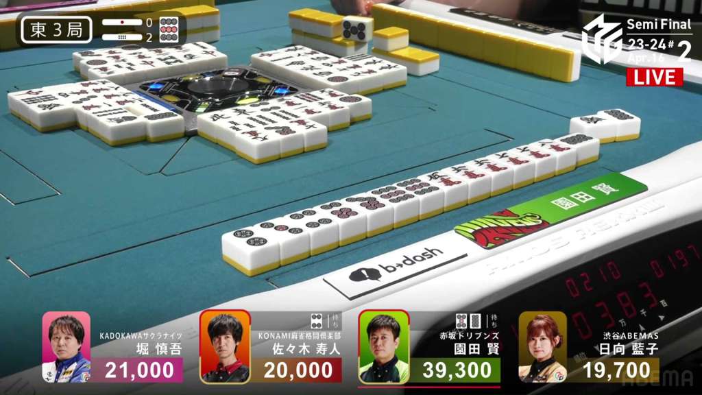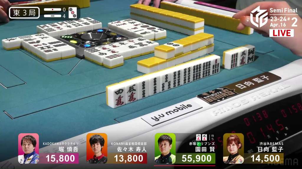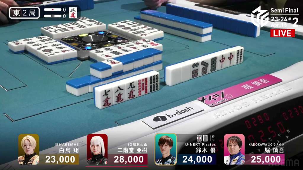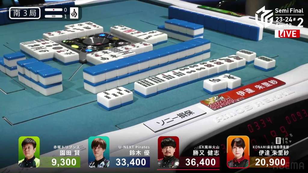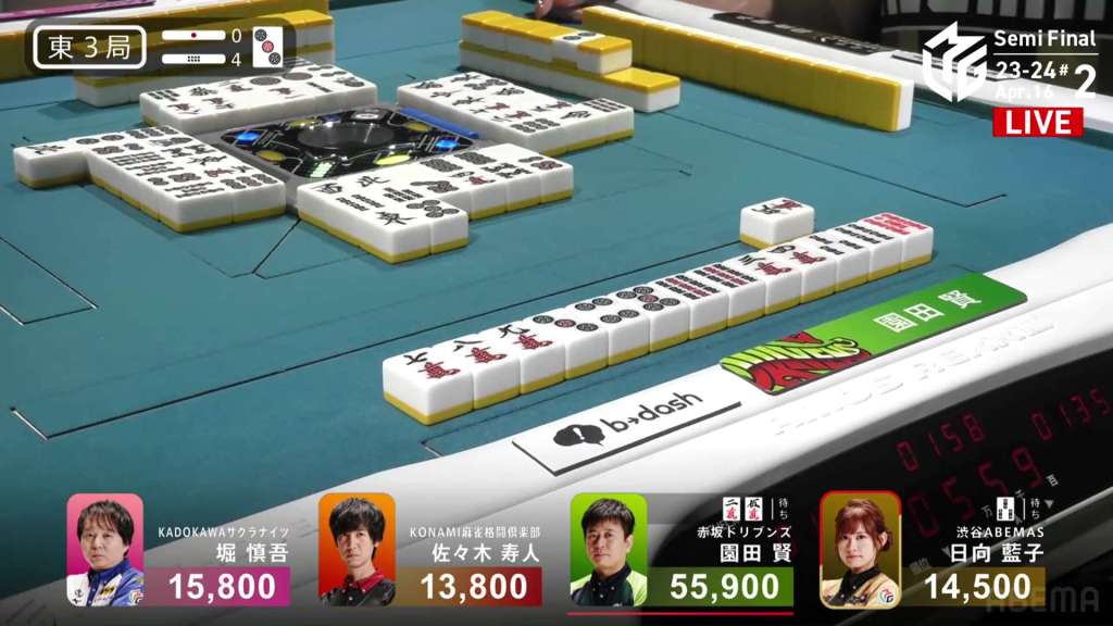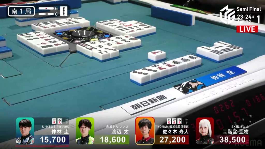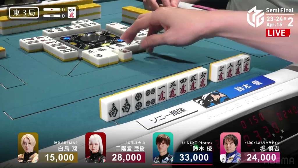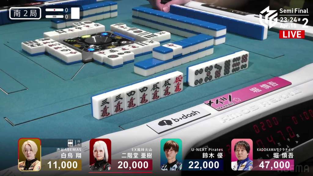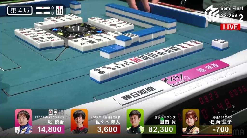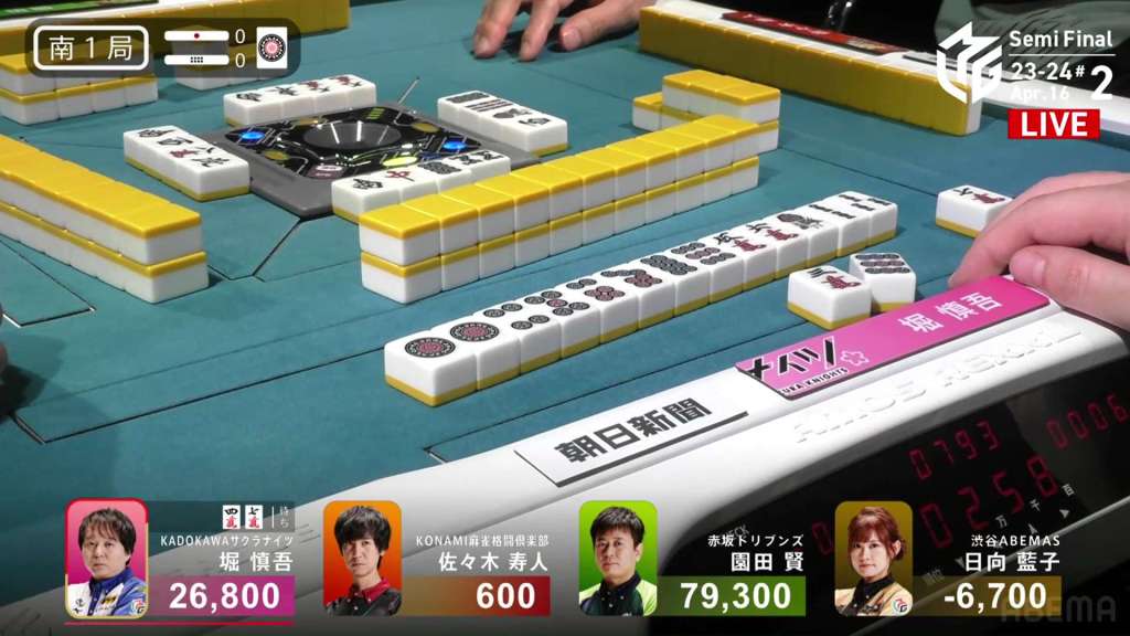 In E3-0, Hori is in 3rd place, 4,000 behind 2nd place Aki and 9,000 behind 1st place dealer Yu. Hori is hoping to do well this game and maybe get the team’s first 1st of the semifinals.