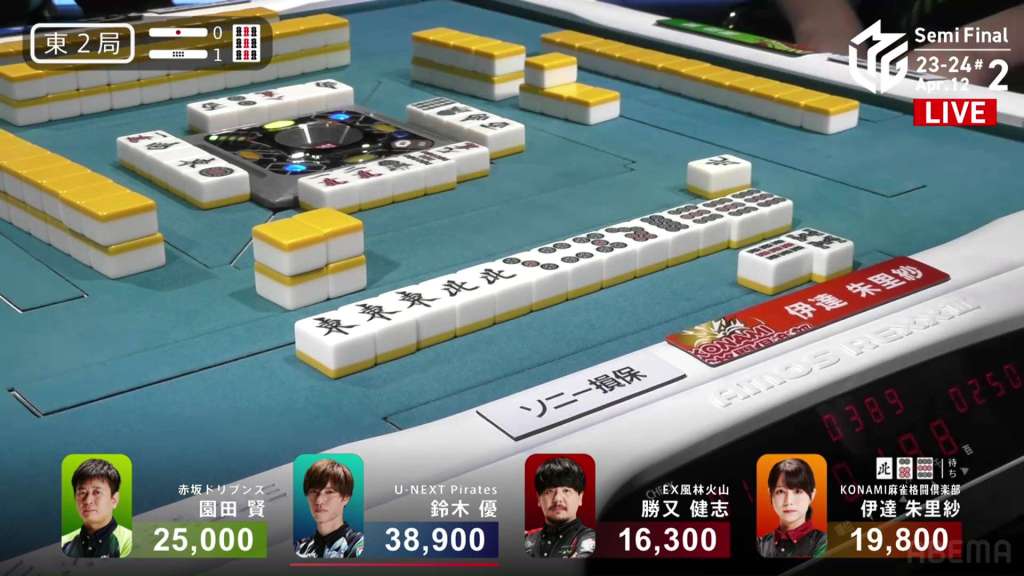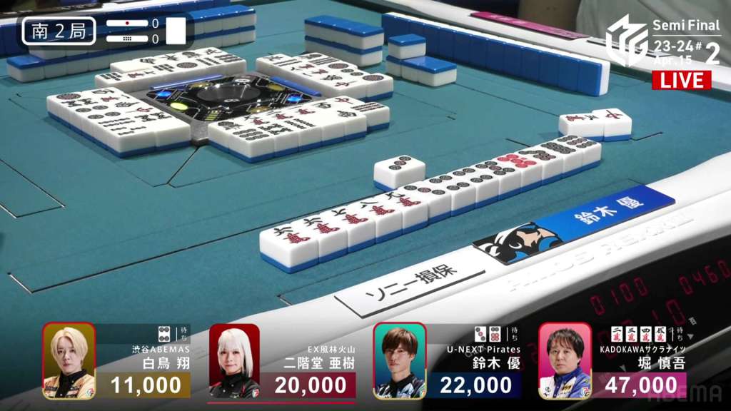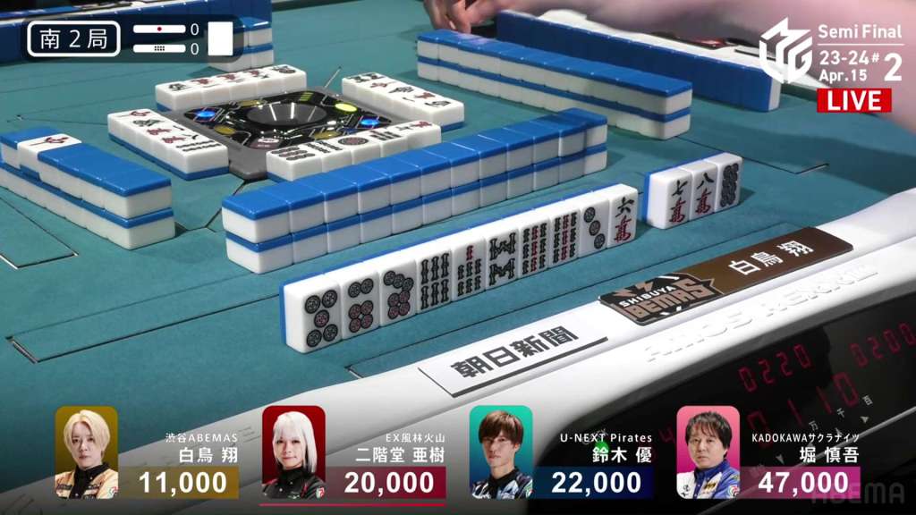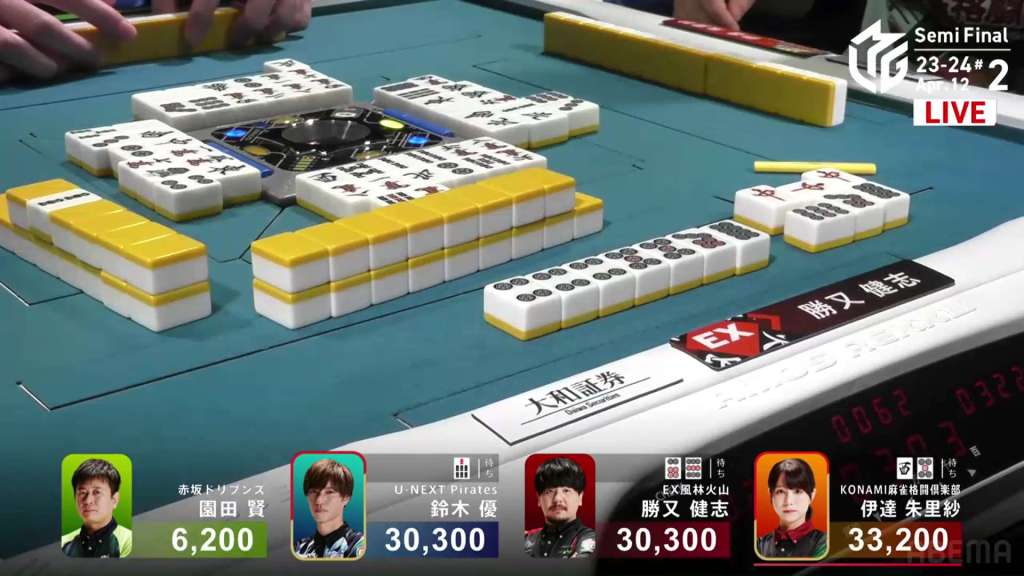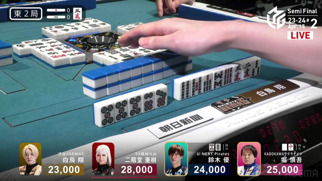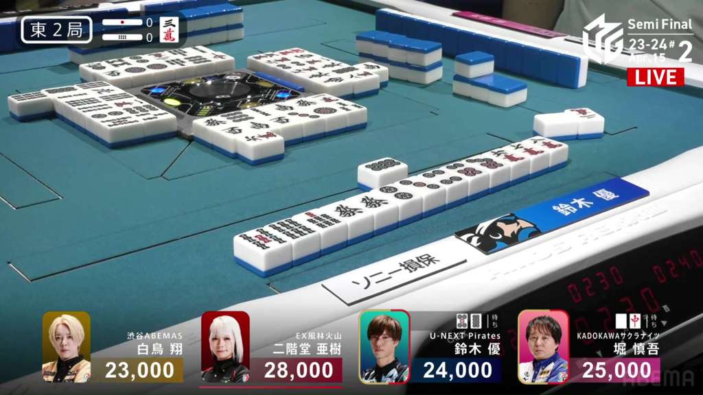 In E2-0, Yu is just barely in 3rd place after his riichi in the first hand was beaten by an open hand.