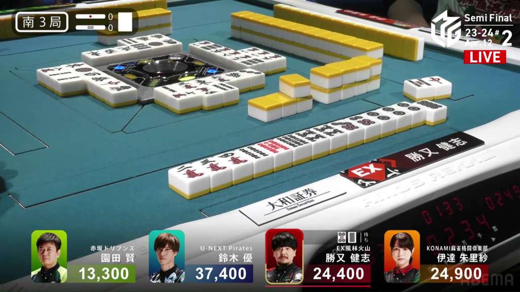 In S3-0, Katsumata is the dealer in 3rd place, 500 behind 2nd place Date and 13,000 behind 1st place Yu.