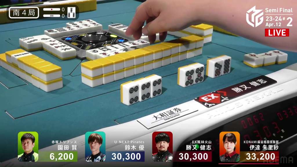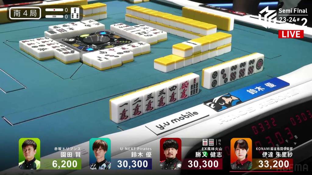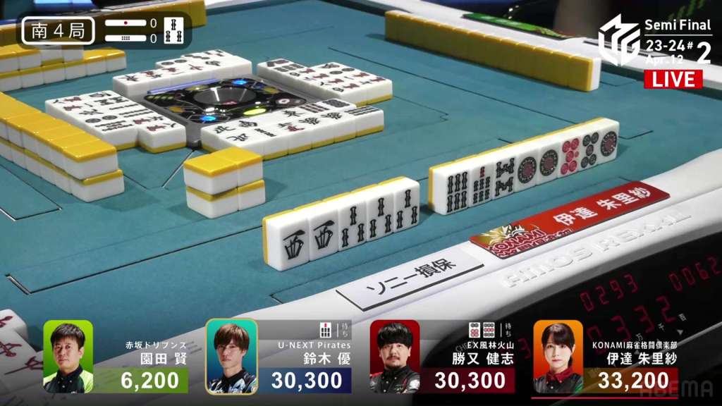 In S4-0, the top three players are in a heated race. Date sits on top and is the dealer with 3, while Katsumata and Yu are both tied for 2nd place with 30,300. With the scores so close, the next winner likely win the game.