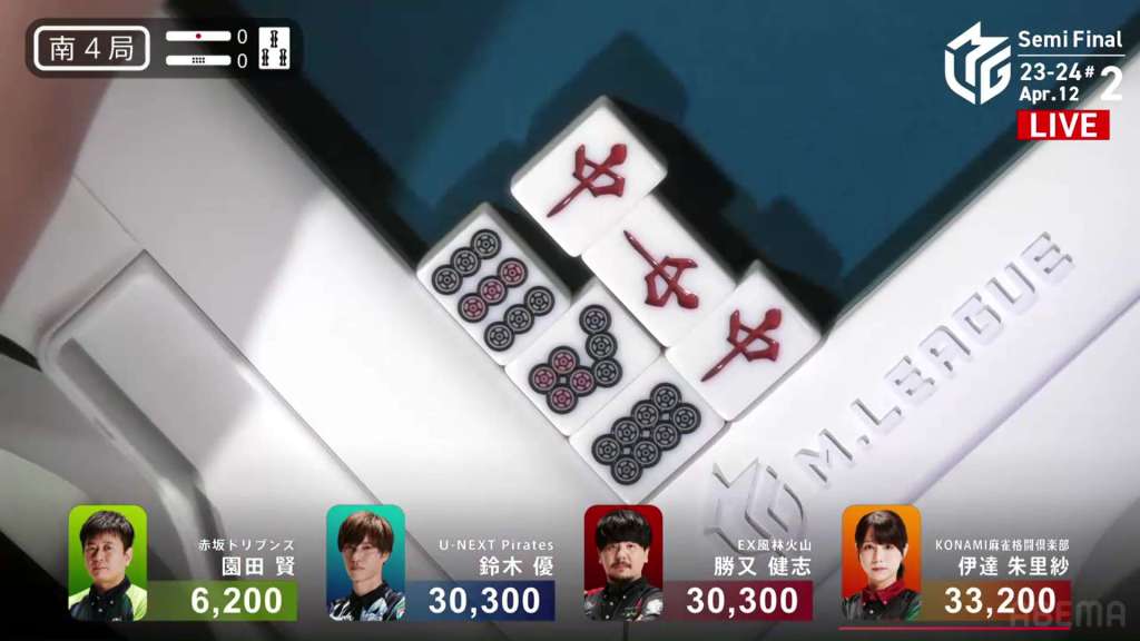 Katsumata starts with a very strong iishanten with a connected red 5s and pinfu almost guaranteed. Despite his three ryanmens in hand, Katsumata isn’t able to fill in any of them in the first row and instead makes a triplet of 2p, breaking the pinfu. At the start of the second row, Katsumata gets to tenpai and calls riichi on a 58p ryanmen. Three turns later, Katsumata draws the 8p and wins the hand. Katsumata wins with Riichi/Tsumo/Tanyao/Aka 1 for 4,000 all, moving into 1st.