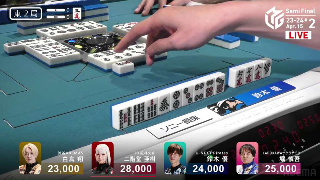 At the start of the second row, Matsugase is able to call pon on the east and advances to iishanten. To Matsugase’s left, Mizuhara makes a pon on the 8s and is the second to tenpai, waiting on a 25m ryanmen.