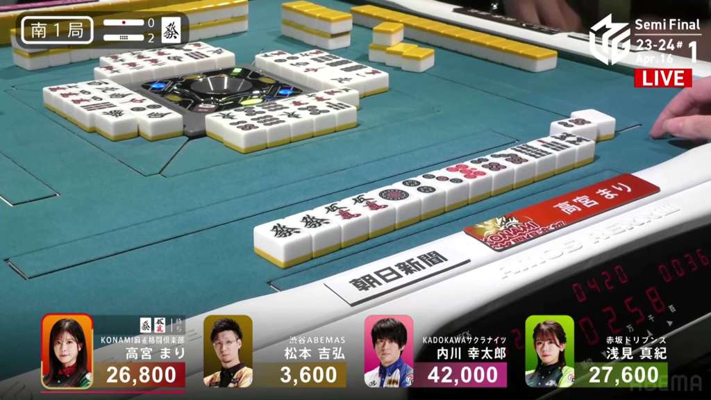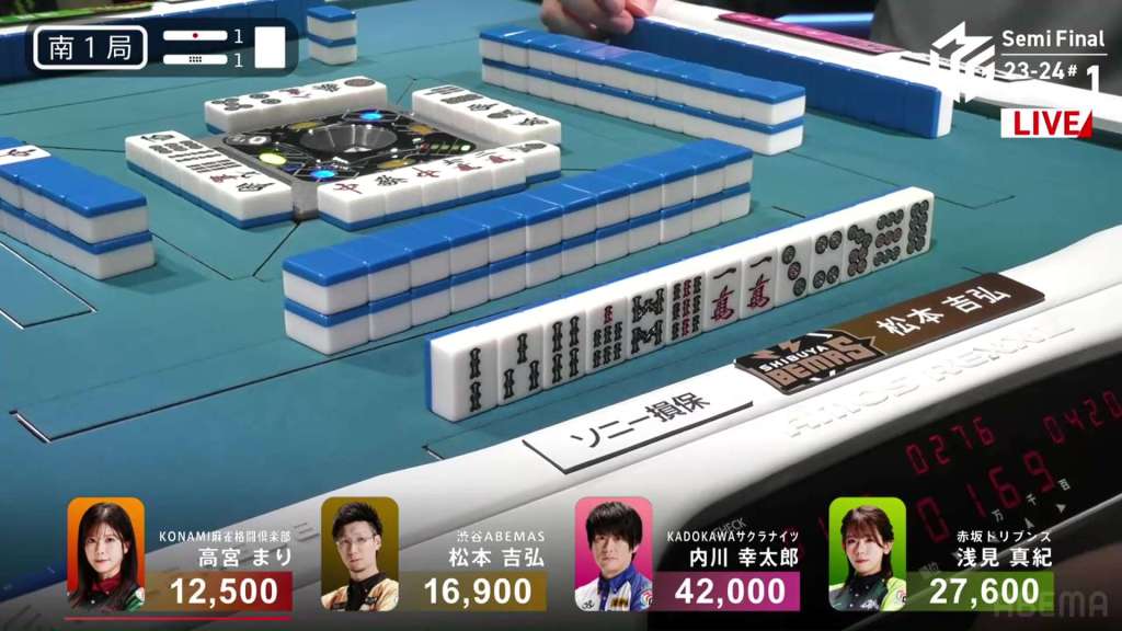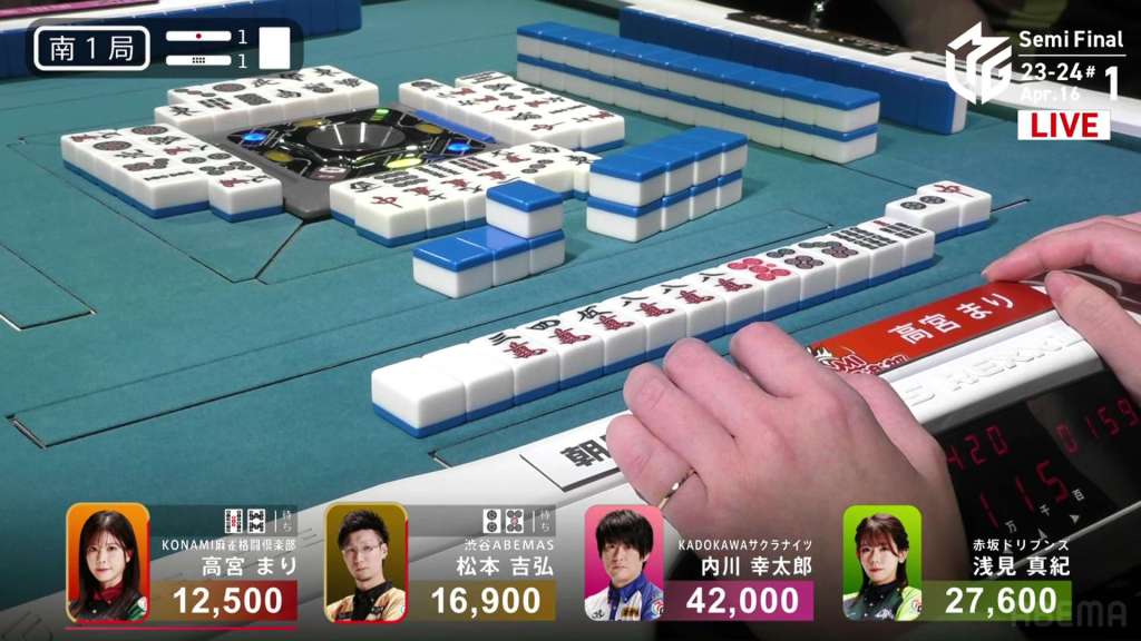 In S1-1, Takamiya is the dealer in 4th place, 4,400 behind 3rd place Matsumoto and 15,100 behind 2nd place Asami.