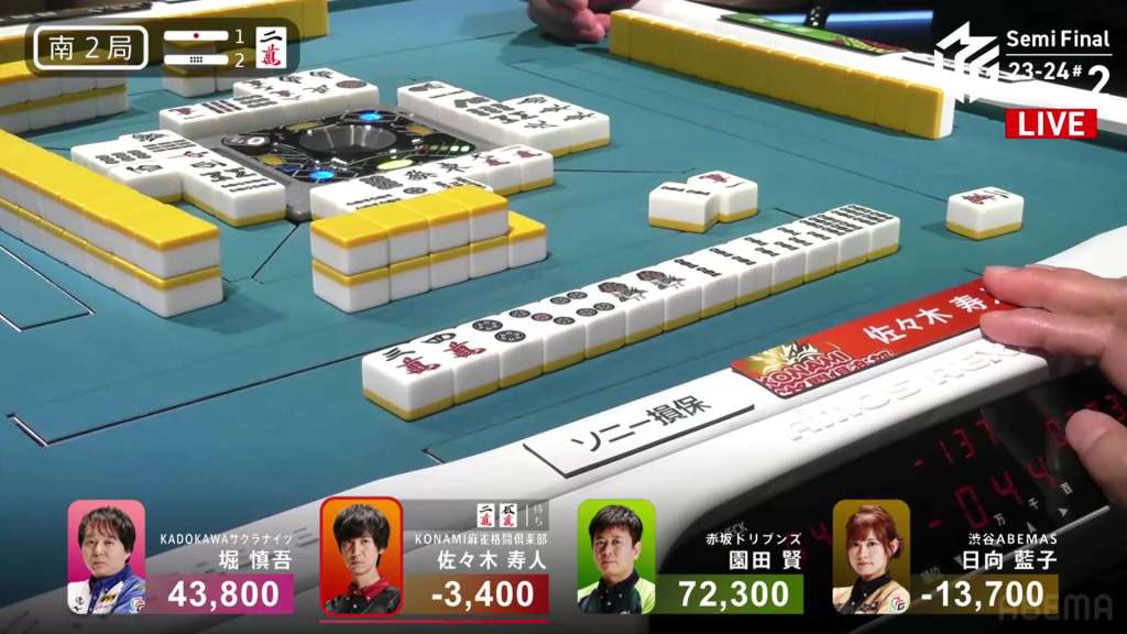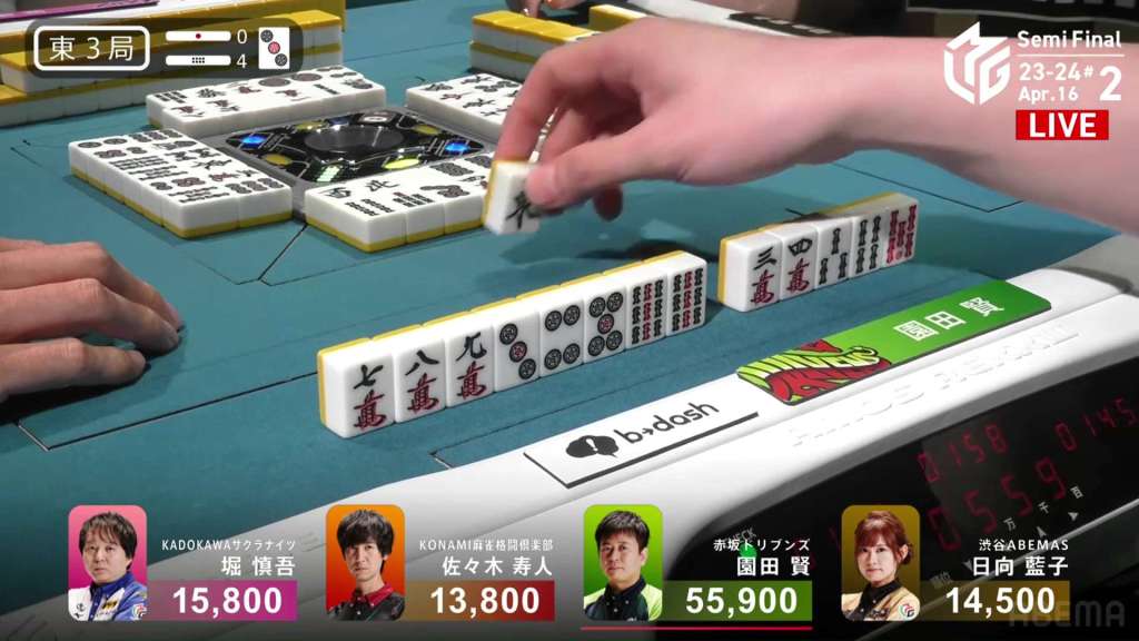 Sonoda starts off 2-shanten with two potential ryanmens and a loosely connected 9p dora. On turn 2, he fills in one of the ryanmens and advances to iishanten. On his next turn, he gets to a ryanmen-ryanmen iishanten with the potential to use the dora on an 8p draw. As Sonoda waits, 3rd place Hisato advances his hand quite well as well. On turn 5, Hisato is the first to tenpai and calls riichi on a 4p kanchan, guaranteed a 345 sanshoku and a mangan if he wins.
