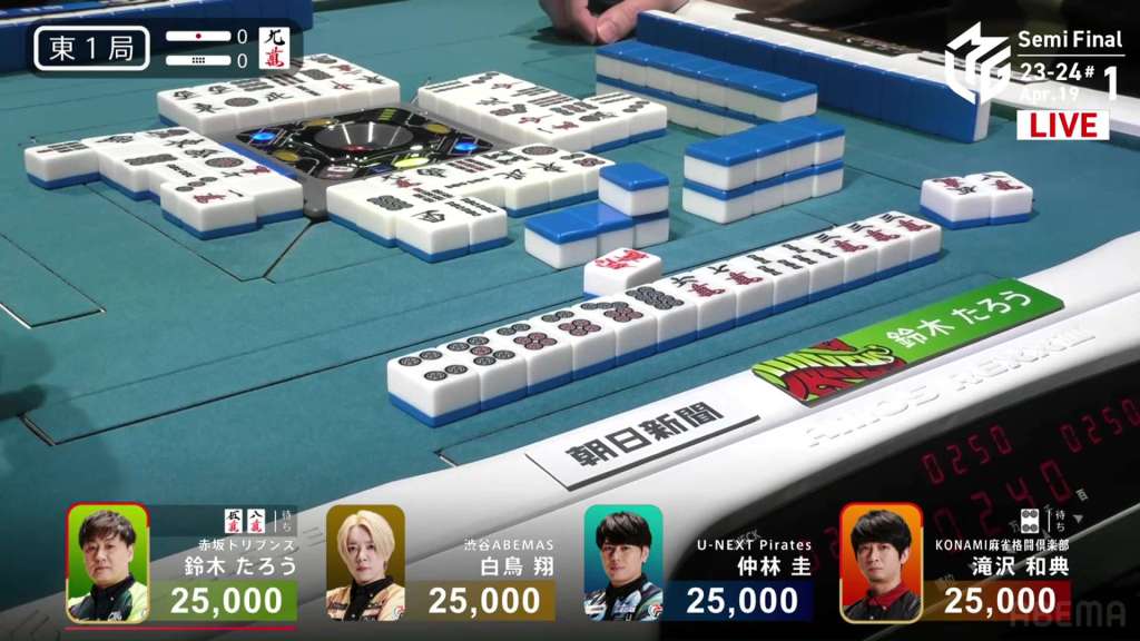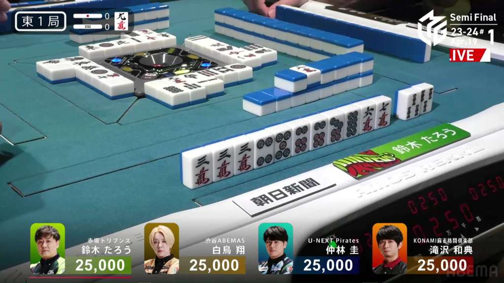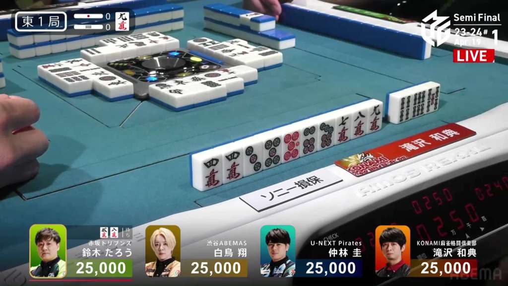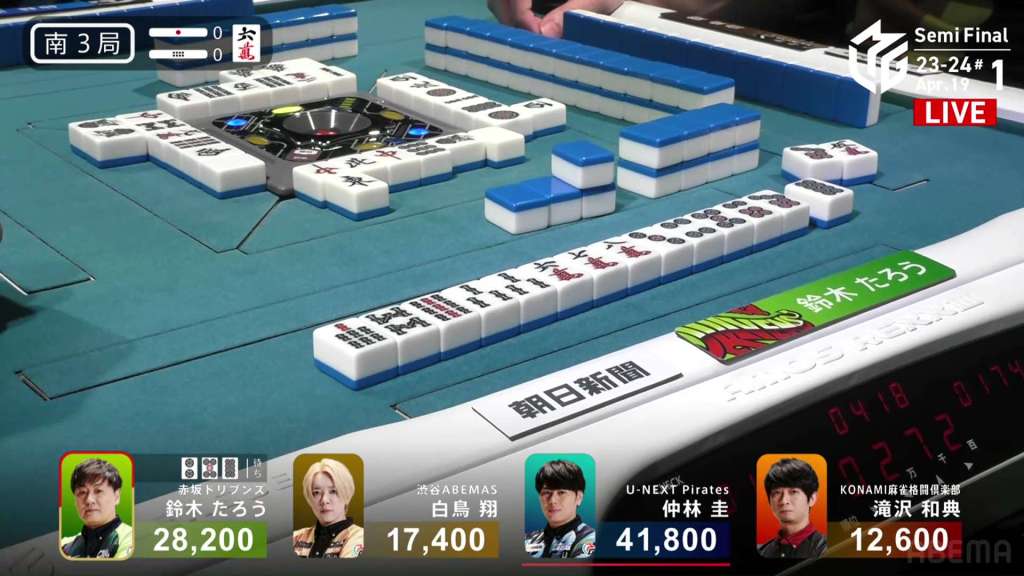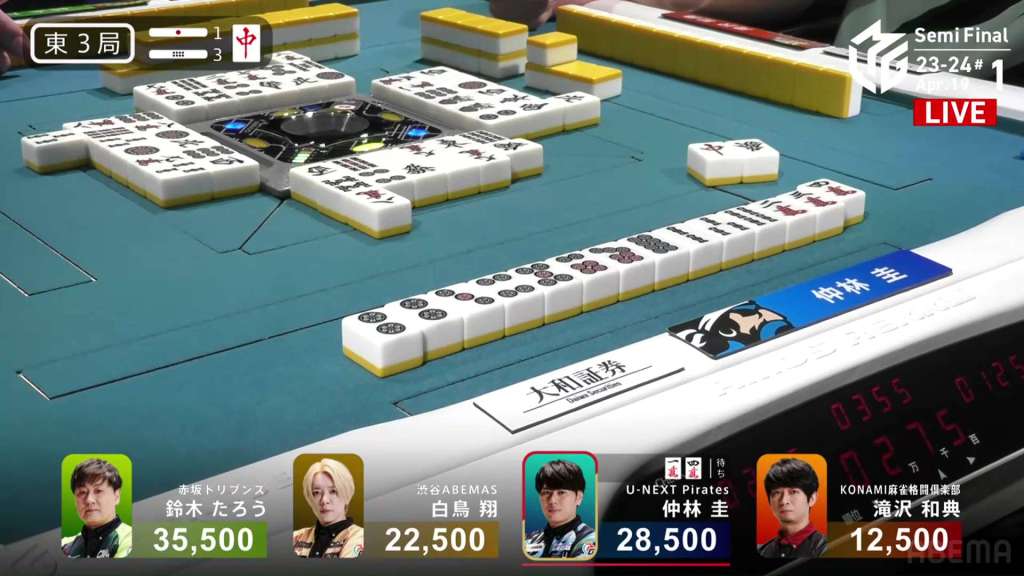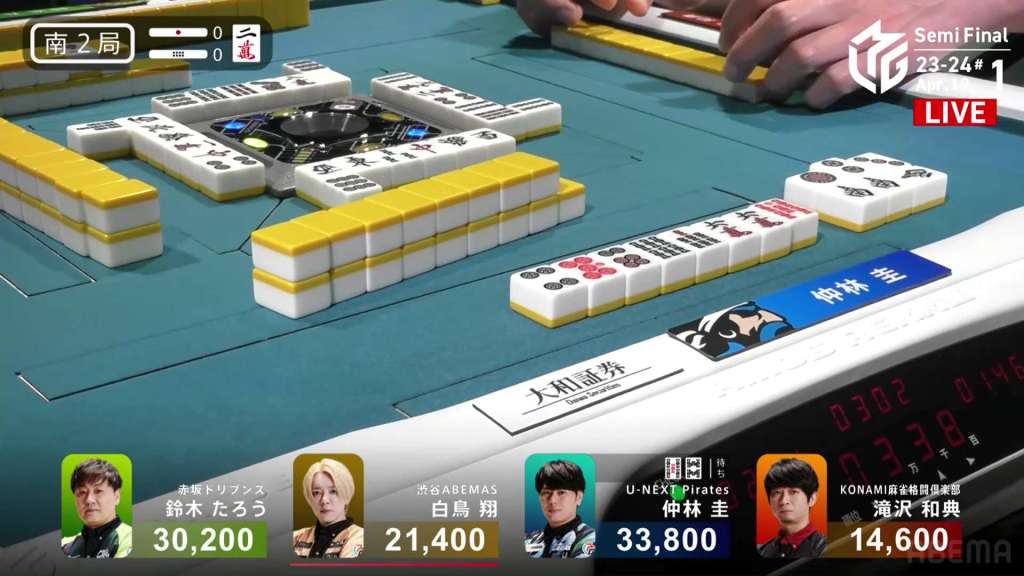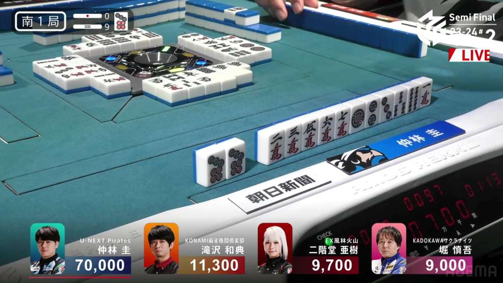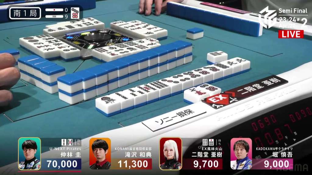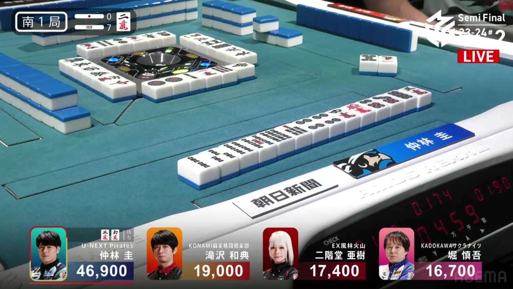 In S1-7, Nakabayashi is the dealer in 1st place and holding a 27,900 lead over 2nd place Takizawa. He started the dealership in S1-0 and took each hand to a draw or won it himself. He is closing in on the M-League record of 10 honba.