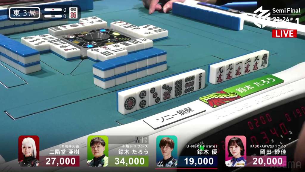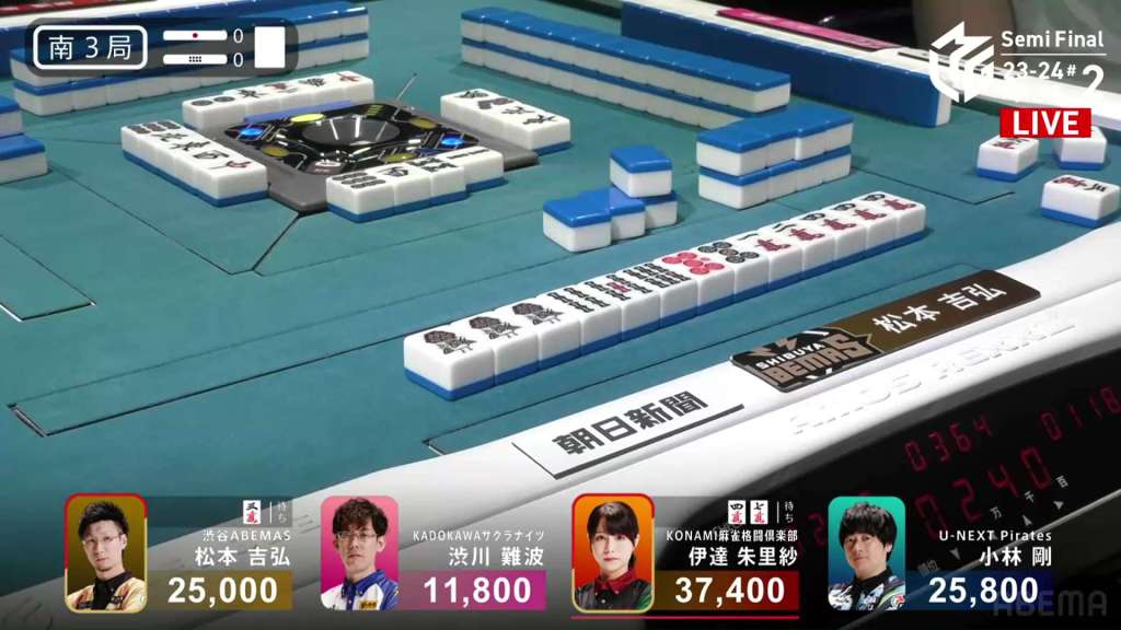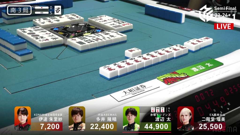 In S3-5, Futoshi is the dealer in 1st place and on a roll, winning the past two hands and holding a 19,400 lead over 2nd place Rumi.