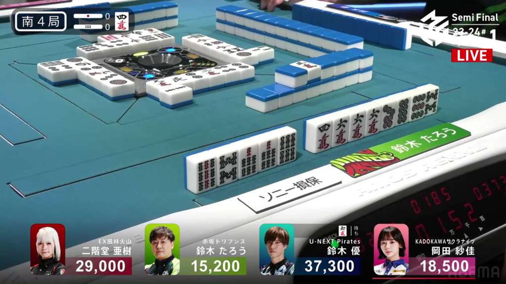 In S4-0, Aki is in 2nd place and 8,300 behind 1st place Yu. In order to finish on top, Aki needs a 3/40 direct hit, a mangan tsumo or a haneman ron.