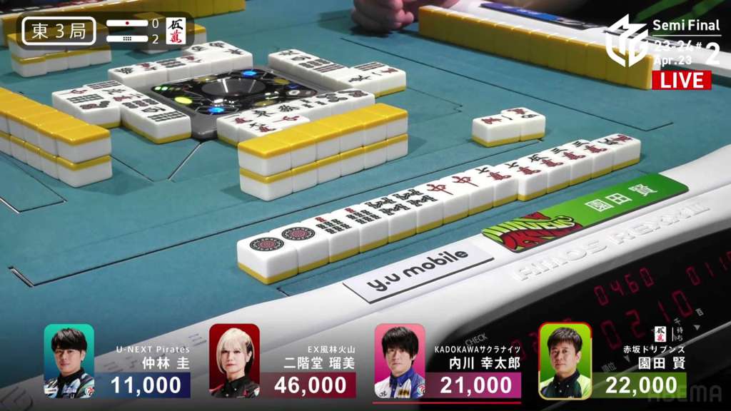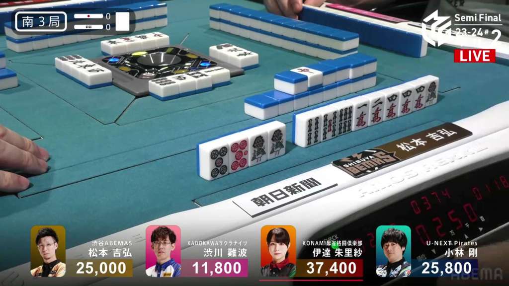 However, on Matsumoto’s ippatsu turn, Matsumoto gets the 3m and wins the hand. Matsumoto wins with Riichi/Ippatsu/Tsumo/Aka 1 for 2,000/4,000 plus one riichi stick. Because of that riichi from Date, Matsumoto moves into 1st place going into the last hand of the game.