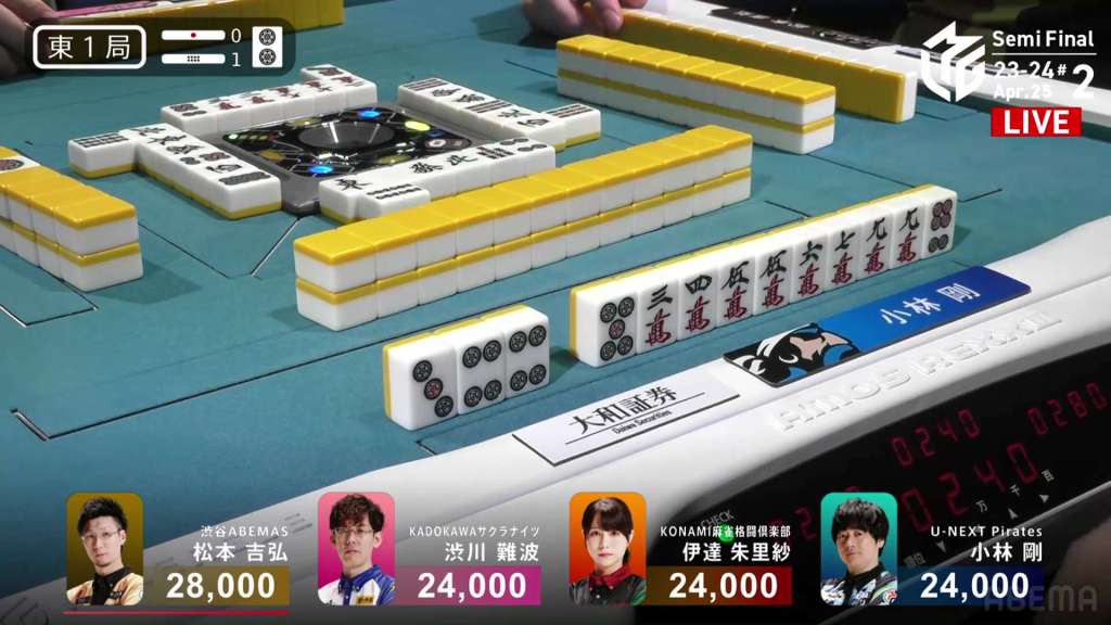In E1-1, Date is sitting in a tie for 2nd place after the first hand went to a draw. After Takamiya lost the previous game, a win is imperative.