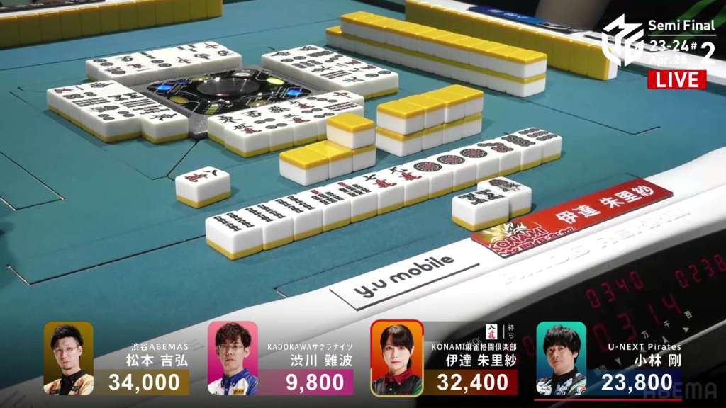 Rumi starts out the hand with a strong 3-shanten with a ryanmen and a secured red 5m double dora. Within her first three turns, she creates a 258m 3-sided wait and fills in the pinzu ryanmen in her hand to get to iishanten. To her left, 1st place Futoshi is busy making quick calls. In his first four turns, he makes three calls to get to tenpai on a 3p kanchan.