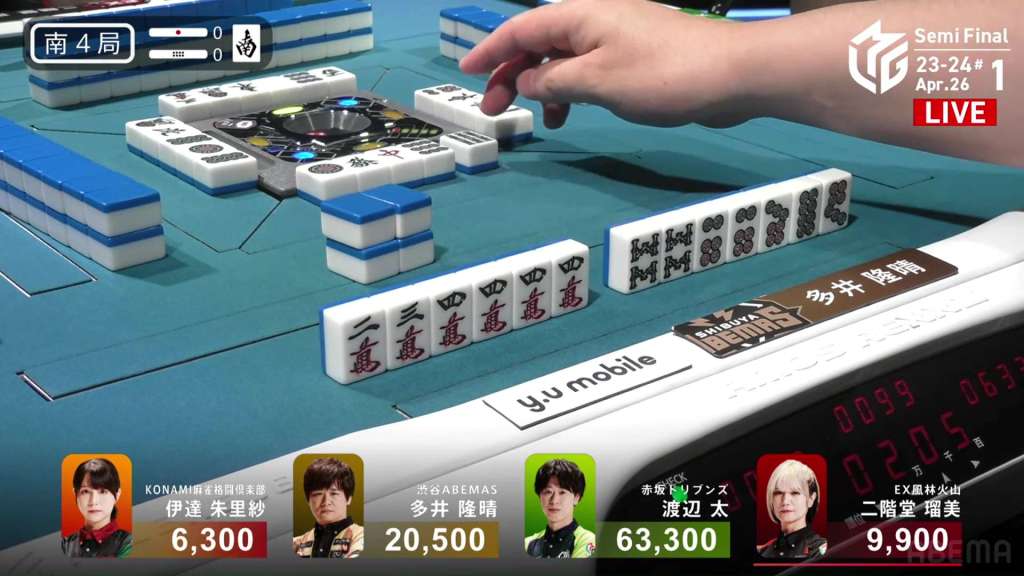 Aki starts out the hand 3-shanten with a ryanmen and a 3-sided wait. Early on, Aki adds the potential for ittsuu to her hand and gets to iishanten on turn 3. Around her, both Yu and Taro are active. With a pon of the 3m, Yu gets to tenpai on a 6m kanchan before the row is over. In the second row, Aki draws the dora 4m and chooses to break her ittsuu to not discard it. On her next turn, she pairs up the 4m. Soon after, Taro gets to tenpai and calls riichi on a 45m wait. Being 3,200 behind 3rd place Okada, Taro needs to win by tsumo or on the 4m to get to 3 han.