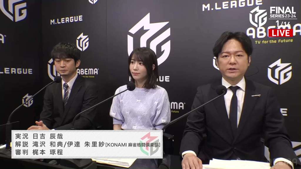 Our play-by-play commentator for the first day of the finals is Hiyoshi Tatsuya. The colour commentators are Konami Mahjong Fight Club players Takizawa Kazunori (滝沢和典) and Date Arisa (伊達朱里紗).