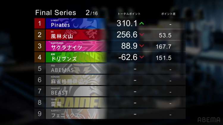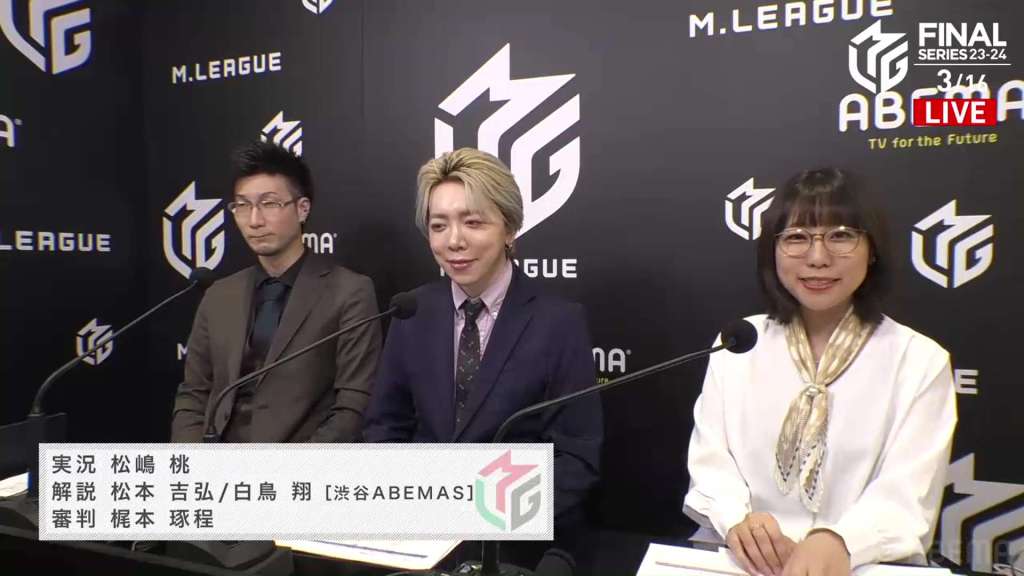 For the second day of the finals, Matsushima Momo did the main commentary. Helping out is the Shibuya Abemas’ ShoMatsu duo (Shiratori Sho (白鳥翔) and Matsumoto Yoshihiro (松本吉弘)). After a quick commercial break, we took a look at the standings.