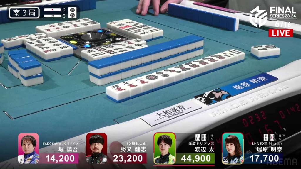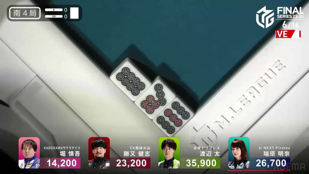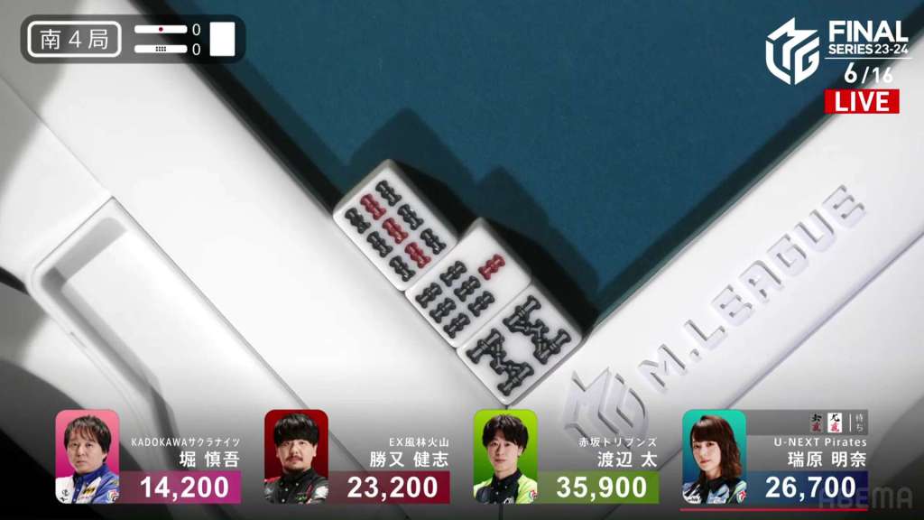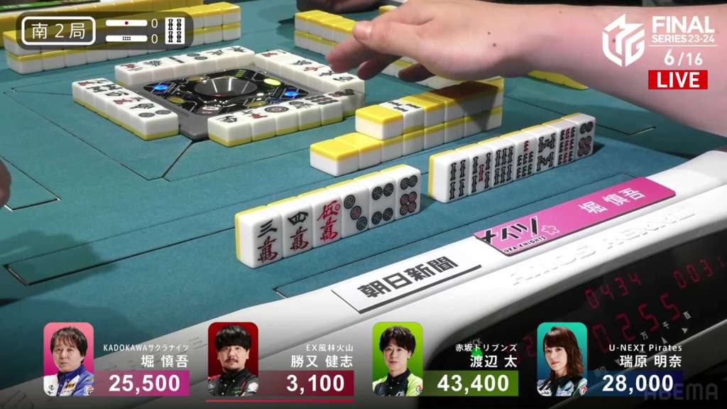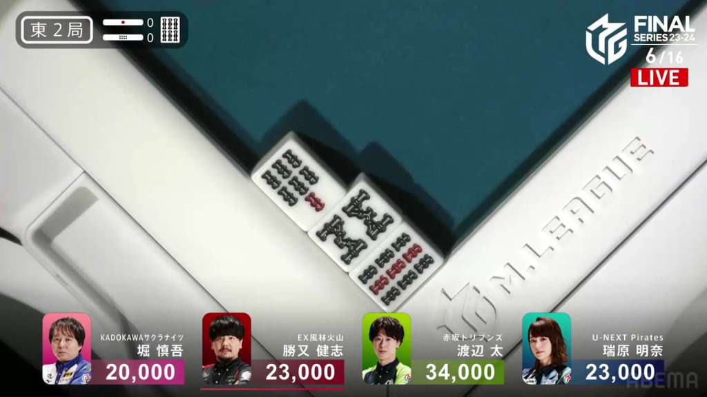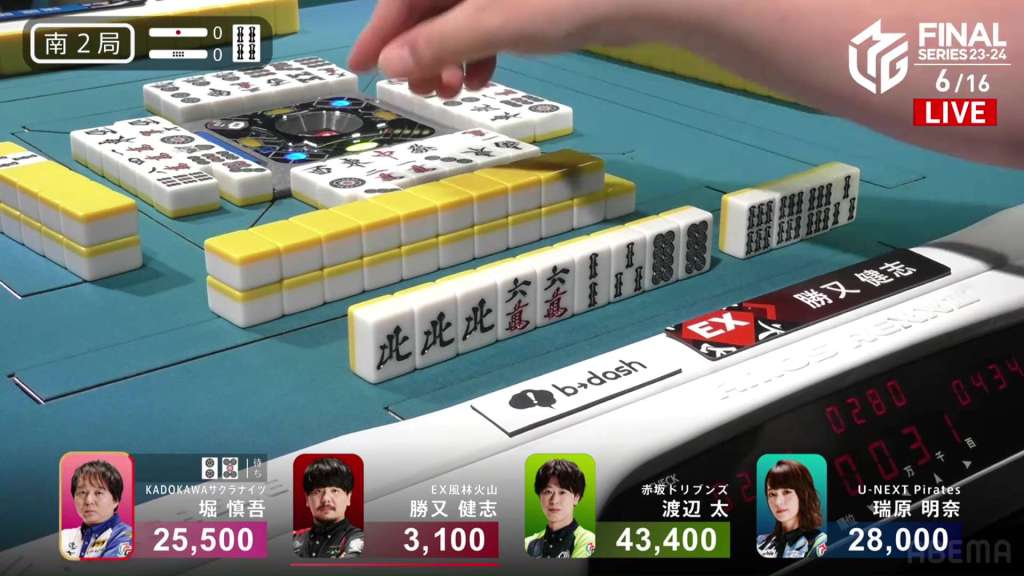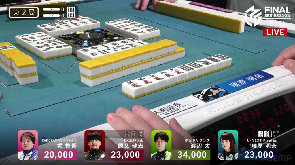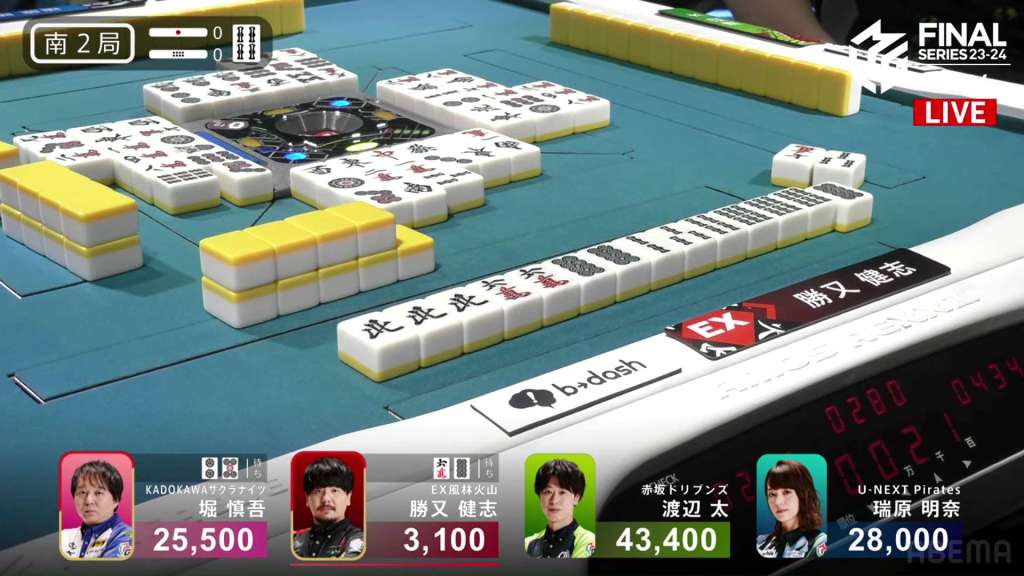 After a short break to get the tiles cleaned, the game continued in S2-0. Katsumata is the dealer and is yet again in 4th place, 22,400 behind 3rd place Hori and 24,900 behind 2nd place Mizuhara.