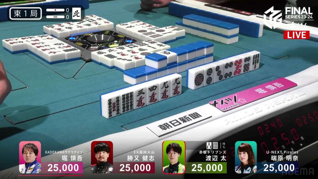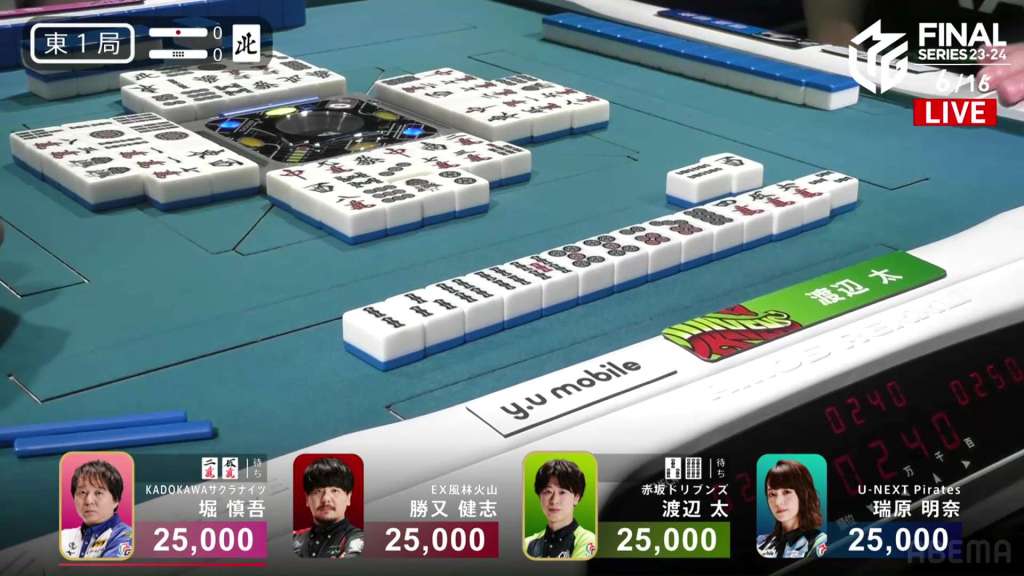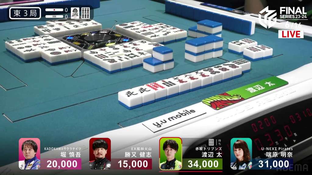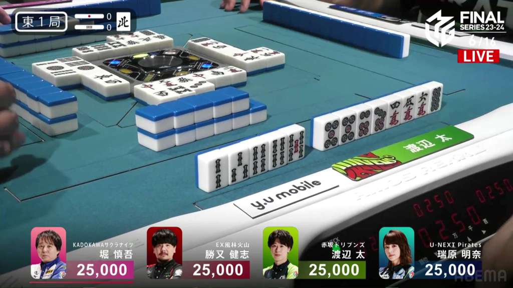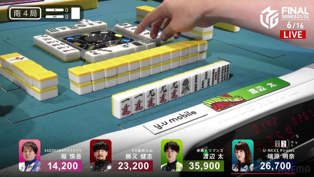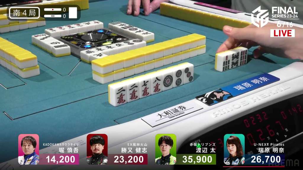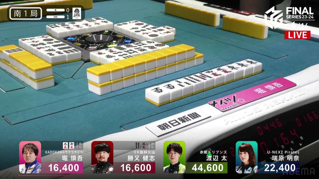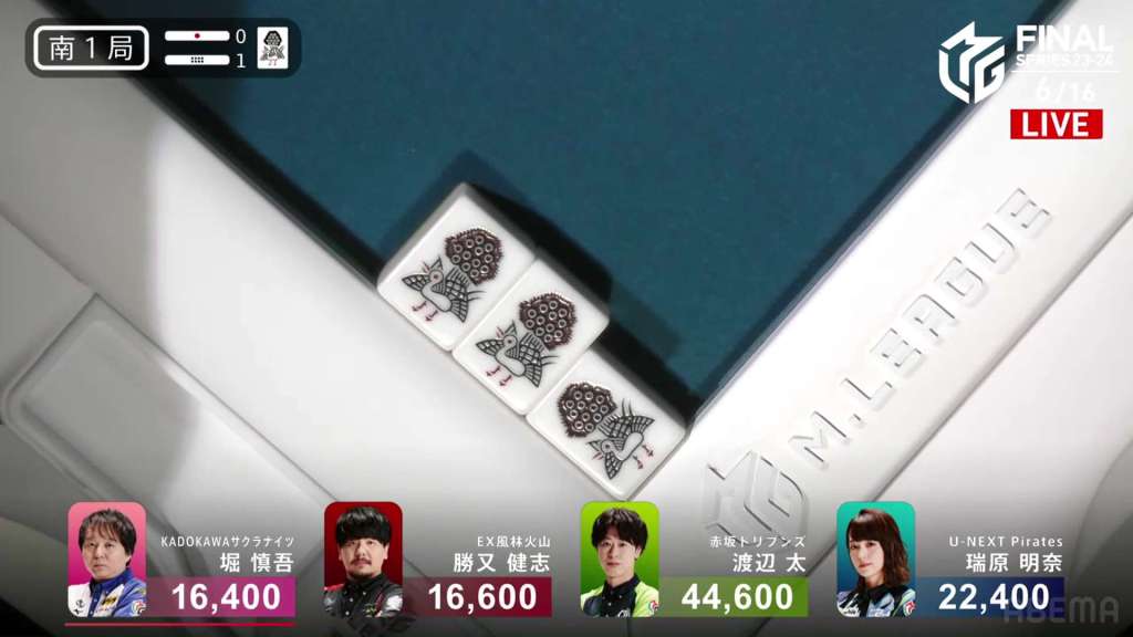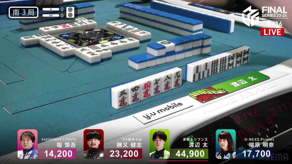 After a short break to get the tiles cleaned, the game continued in S2-0. Katsumata is the dealer and is yet again in 4th place, 22,400 behind 3rd place Hori and 24,900 behind 2nd place Mizuhara.