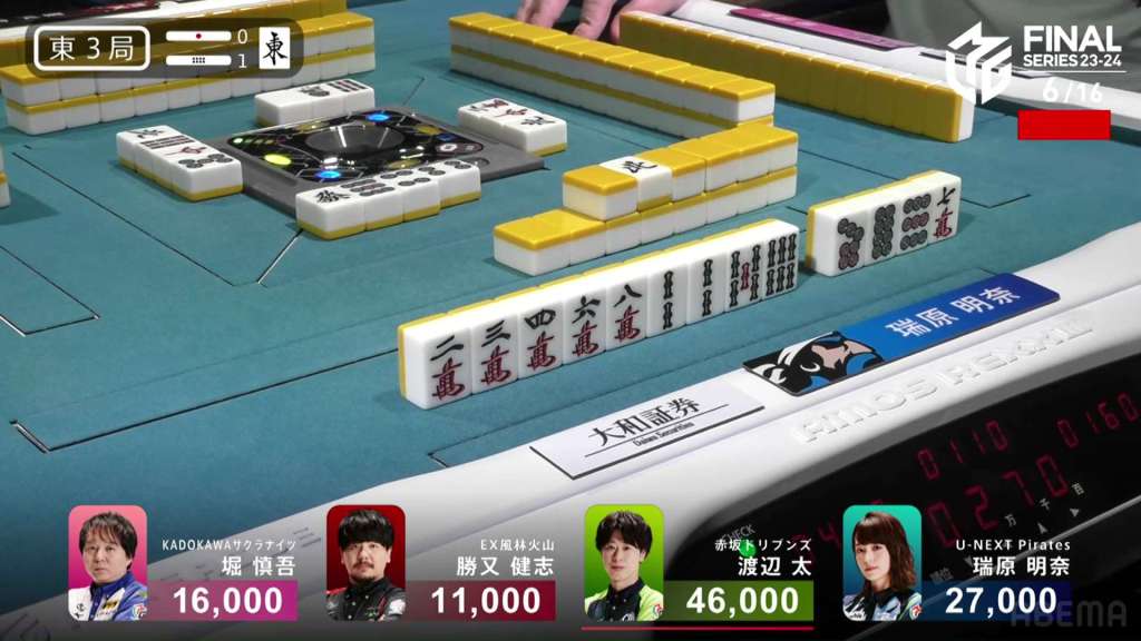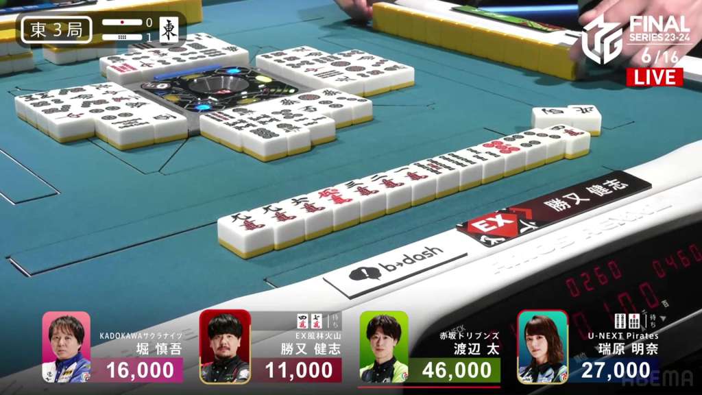 With few safe tiles and his team falling behind, he just pushes through. He fills in a 3p kanchan, draws a red 5m and creates a ryanmen. With his hand composition, he is guaranteed a good wait. But, he is still 2-shanten with only one more row of discards left. Near the middle of the second row, he fills a ryanmen to get to a perfect iishanten. On his next draw, he gets to tenpai and calls riichi on a 47m ryanmen, guaranteed at least a mangan if he wins. On the ippatsu draw, he gets the 4m and wins the hand. Katsumata wins with Riichi/Ippatsu/Tsumo/Pinfu/Aka 2 for 3,000+100/6,000+100 plus one riichi stick, moving Katsumata into 2nd place.