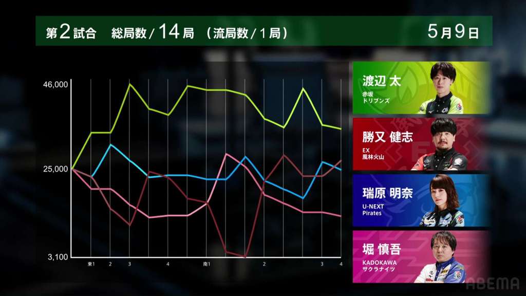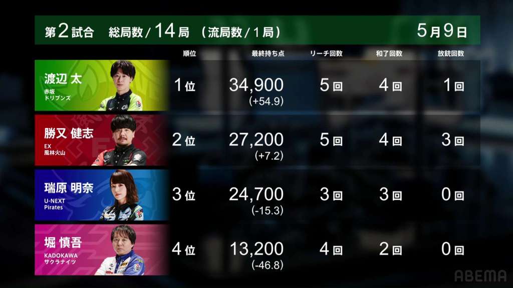 After the Kadokawa Sakura Knights and U-Next Pirates dominated the first five games, Futoshi and the Akasaka Drivens have finally broken through and gotten a 1st. They are still at the bottom, but they are making progress. Hori’s 4th place puts the Kadokawa Sakura Knights a bit further away from the 1st place U-Next Pirates. With Katsumata’s 2nd, they are getting closer to reclaiming 2nd place overall.