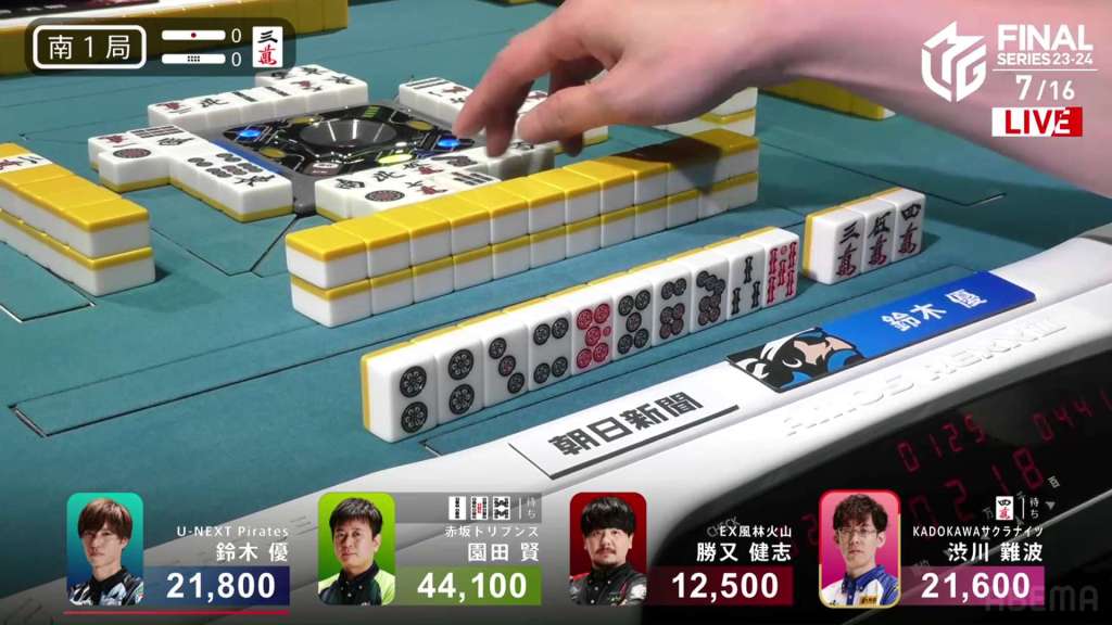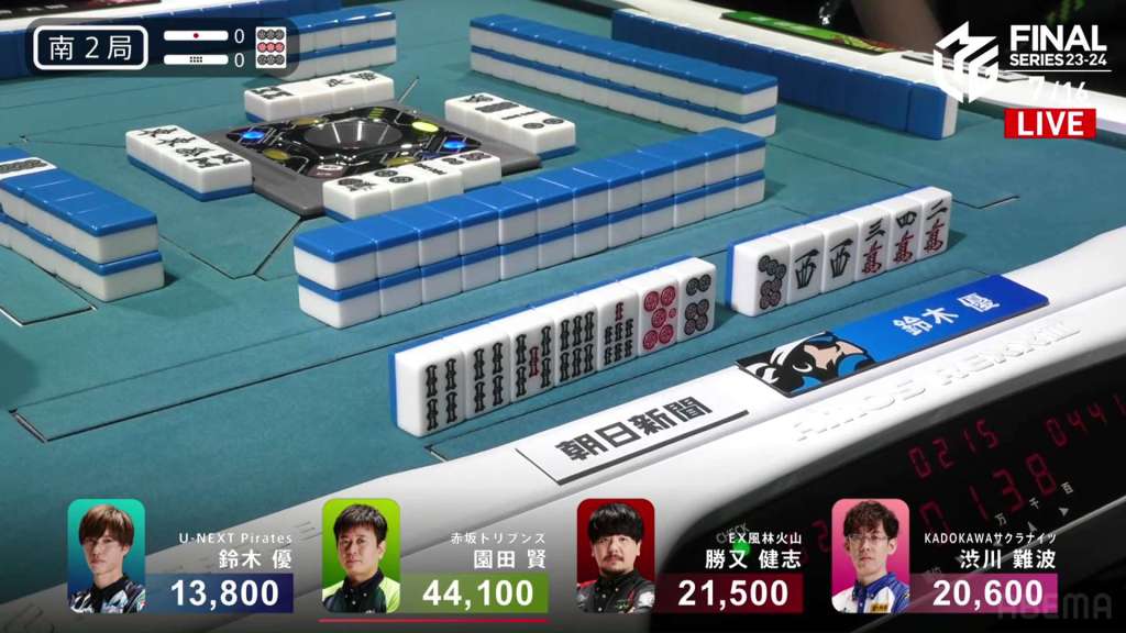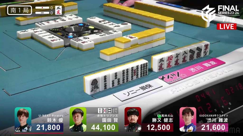 Katsumata starts off 3-shanten with a secured dora 3m and a ryanmen. With Katsumata’s first discard, 1st place Sonoda calls pon on the green dragon, trying to prevent anyone from catching up to him. On turn 4, Sonoda gets to iishanten and before the row is done, Sonoda gets to tenpai on a 258s wait.