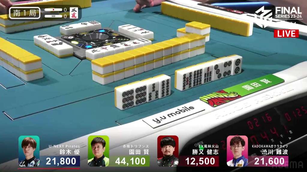 In S2-0, Katsumata has a 4-shanten starting hand with a secured red 5m and a floating 9p dora. Across from him is Yu, wanting to take revenge. Having started at 2-shanten, Yu quickly gets to tenpai on turn 4 and calls riichi on a 4s/west shanpon.